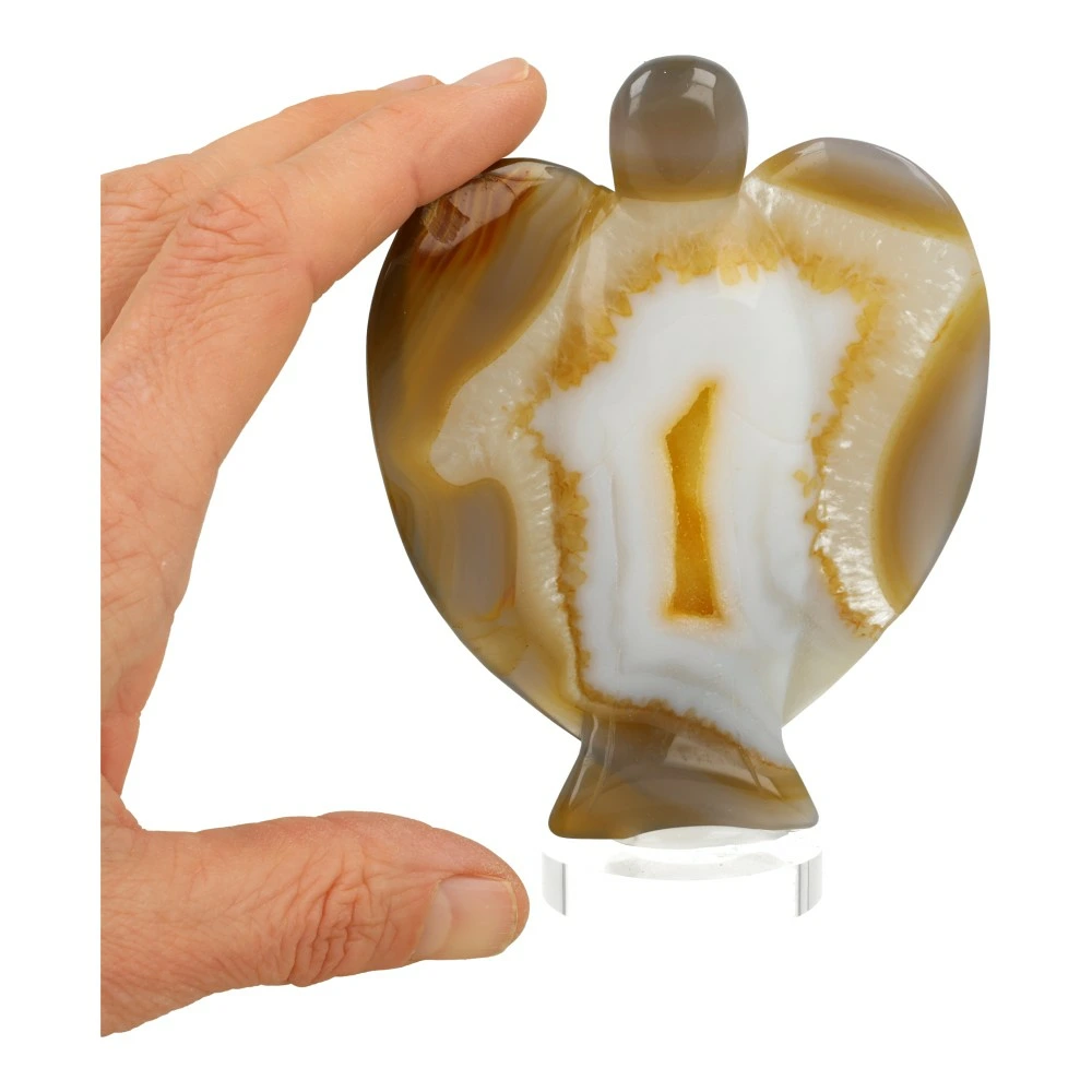 Fraaie agaat engel ‘nr2’met mooie tekening en kristallen holte in de ‘buik’. Unieke engel van ongeveer 11cm hoog en 8,5cm breed. Je ontvangt de agaat engel van de foto op een plexiglas rond voetje, zodat de engel stevig staat. De engel heeft een zachte en verwarmende energie. Helpt je om je hart te openen en de zegeningen van de wereld te ontvangen.