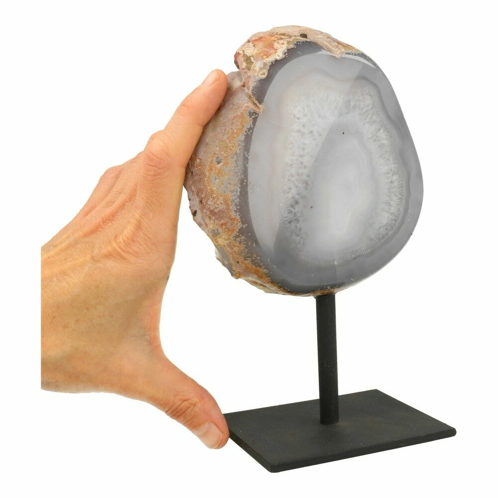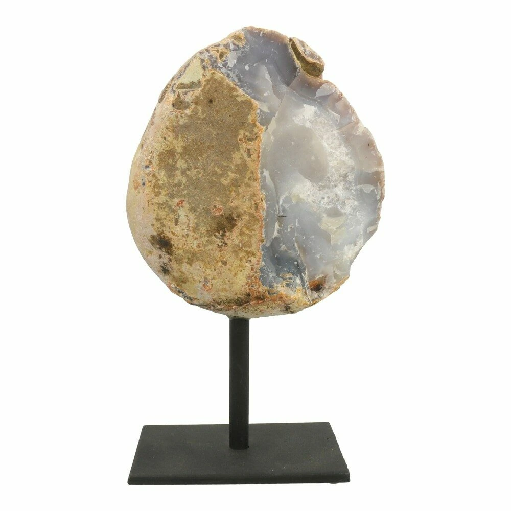 Mooie gepolijste halve agaat geode op standaard ‘A’ uit Brazilië. Deze agaat geode, oftewel holle steen is gehalveerd en de randen zijn gepolijst en op een zwart metalen standaard gezet. Je ontvangt de agaat geode van de foto, deze is puur natuur en niet bijgekleurd. Met fraaie banden van heldere kwarts afgewisseld met agaat. De afmeting is ongeveer 21 cm hoog, waarbij de agaat 13cm hoog is. De agaat is 12 cm breed en 4cm dik. Fraai stuk voor in ieder interieur.