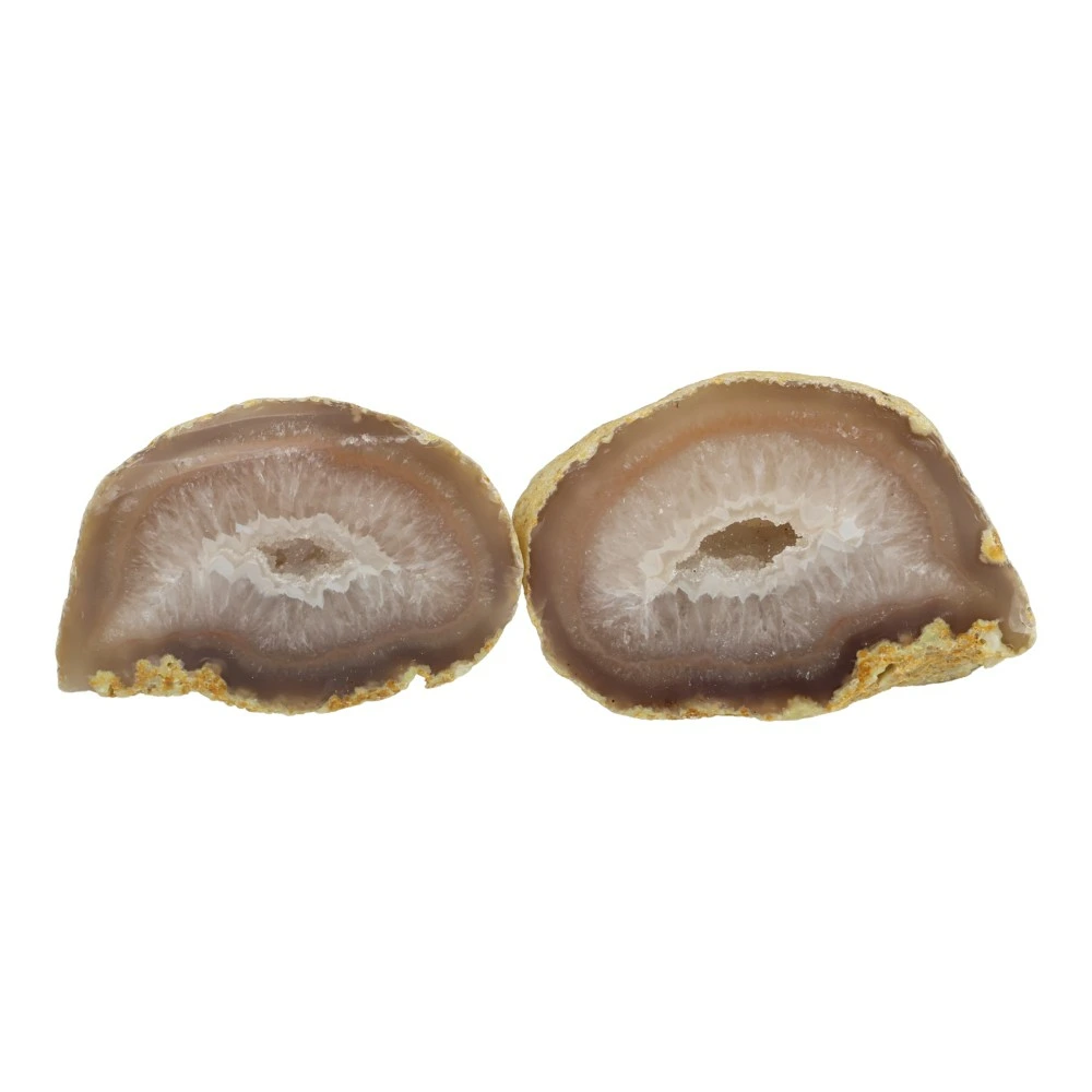 Mooi gepolijste agaat geodepaar ‘nr7’ uit Brazilië. Deze agaat geode, oftewel holle steen is gehalveerd en de randen zijn gepolijst. Je ontvangt het agaat geodepaar van de foto, deze is puur natuur en niet bijgekleurd. In de holte zijn fraaie kwartskristallen te zien. De afmeting is ongeveer 10cm breed en 6,9cm hoog. De ene helft is 5,4cm diep en de andere helft 5,6cm. Een fraai paar voor in ieder interieur om de ruimte met fijne energie te vullen.