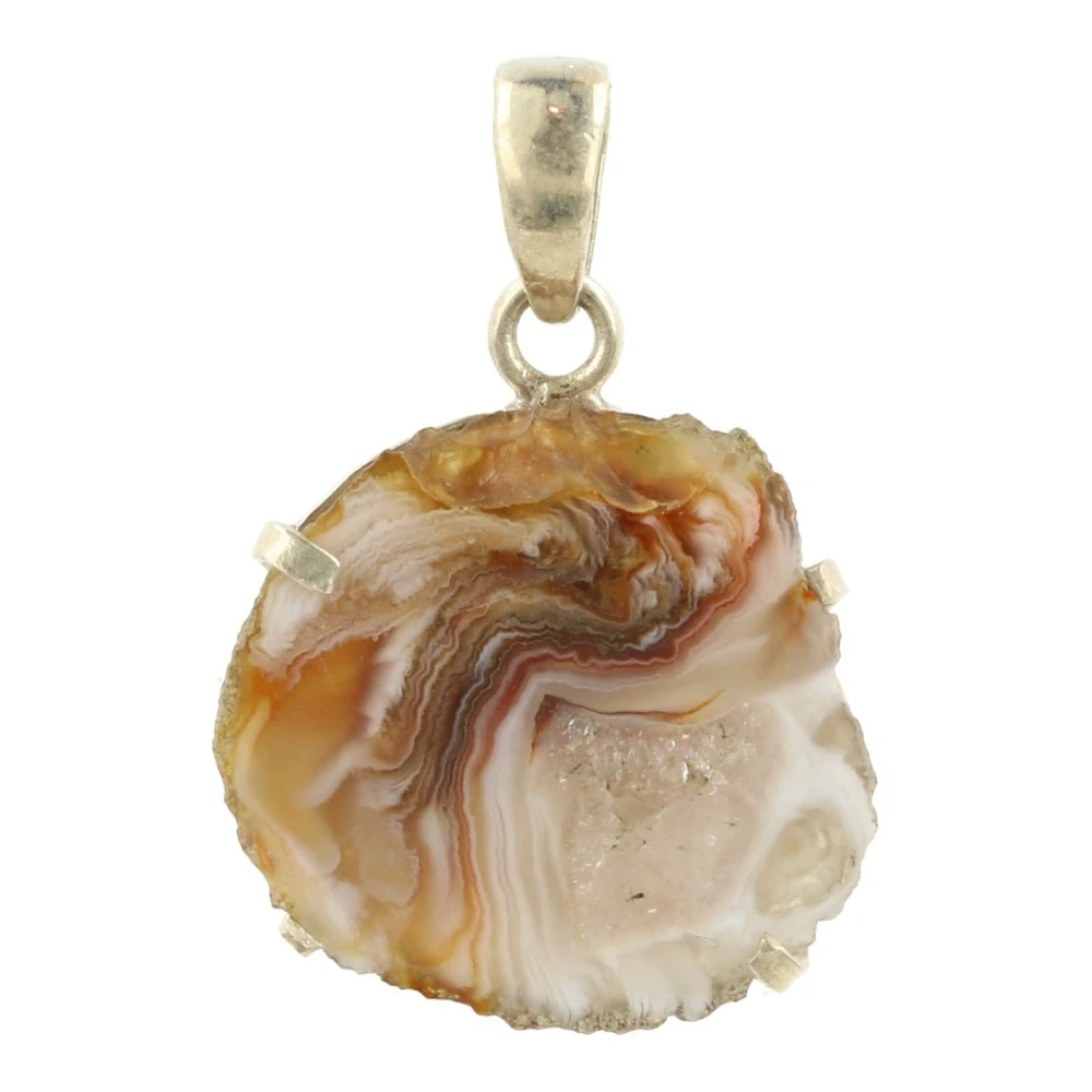 Mooie halve agaat geode hanger met zilveren oogje. Iedere hanger is uniek in tekening en kleurstelling, we zoeken de meest optimale uit bij je bestelling. Je ontvangt een soortgelijke hanger als op de foto. Deze agaat geode, oftewel holle steen is gehalveerd en de randen zijn gepolijst. Je ontvangt deze agaat geode doorboorde hanger zonder koord en kunt hem fraai dragen aan een zilveren ketting.