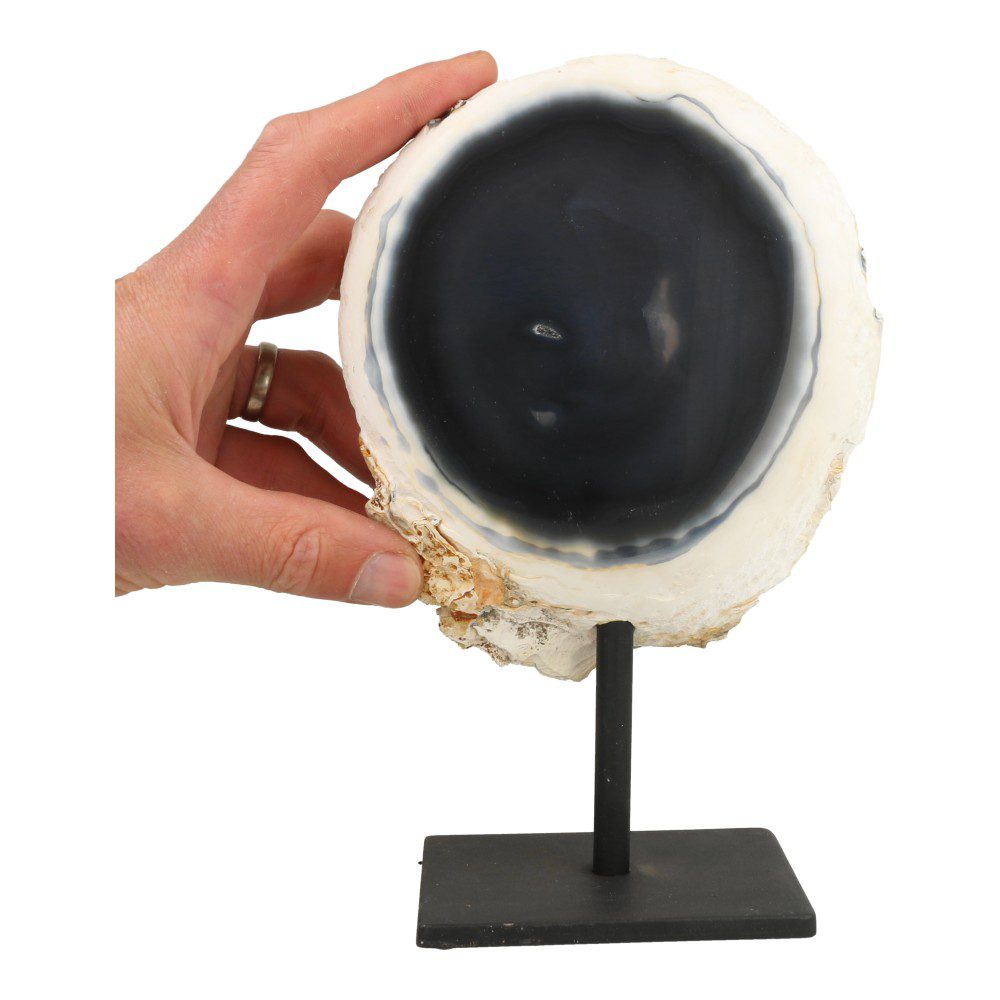 Mooie gepolijste halve agaat geode op standaard ‘I’ uit Brazilië. Deze agaat geode, oftewel holle steen is gepolijst en op een zwart metalen standaard gezet. Je ontvangt de agaat geode van de foto, deze is puur natuur en niet bijgekleurd. De afmeting is ongeveer 22,5 cm hoog, waarbij de agaat 16 cm hoog is. De agaat is 14 cm breed en 4,5 cm dik. Fraai stuk voor in ieder interieur.