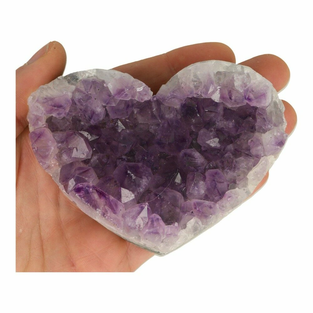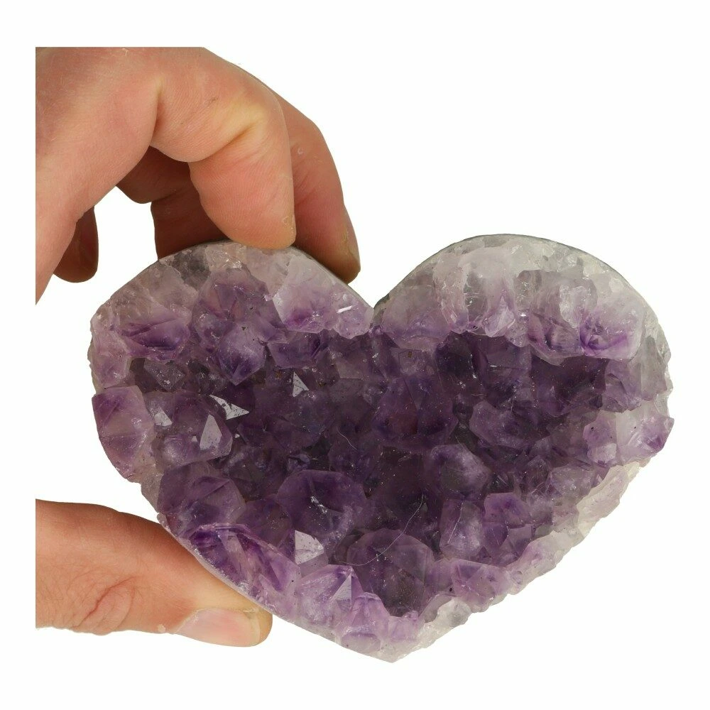 Fraai ruw amethist hart met een afmeting van ongeveer 110mm breed, 83mm hoog en 46mm dik. Uniek hart gemaakt van een stuk amethist geode uit Brazilië met lichtpaarse kleur en liefdevolle uitstraling. Je ontvangt het amethist hart van de foto.