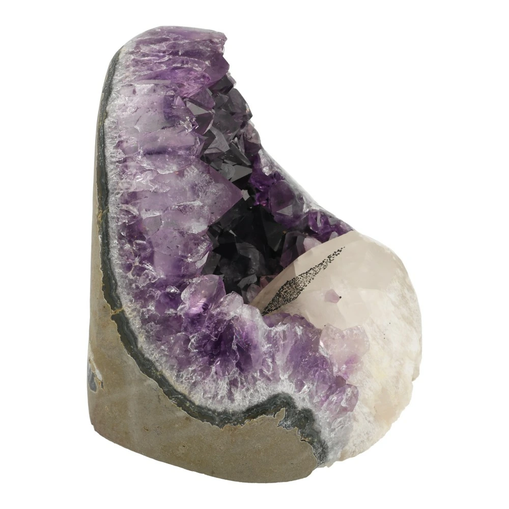 Prachtige donkerpaarse amethist zuil uit Uruguay met gepolijste randen en grote witte calciet met kleine hematiet in ruitvorm. Deze bijzondere, robuuste amethist straalt je tegemoet. De afmeting van deze A-kwaliteit amethist is ruim 12cm hoog, 11cm breed en 11cm diep. Je ontvangt uiteraard deze prachtige amethist van de foto.
