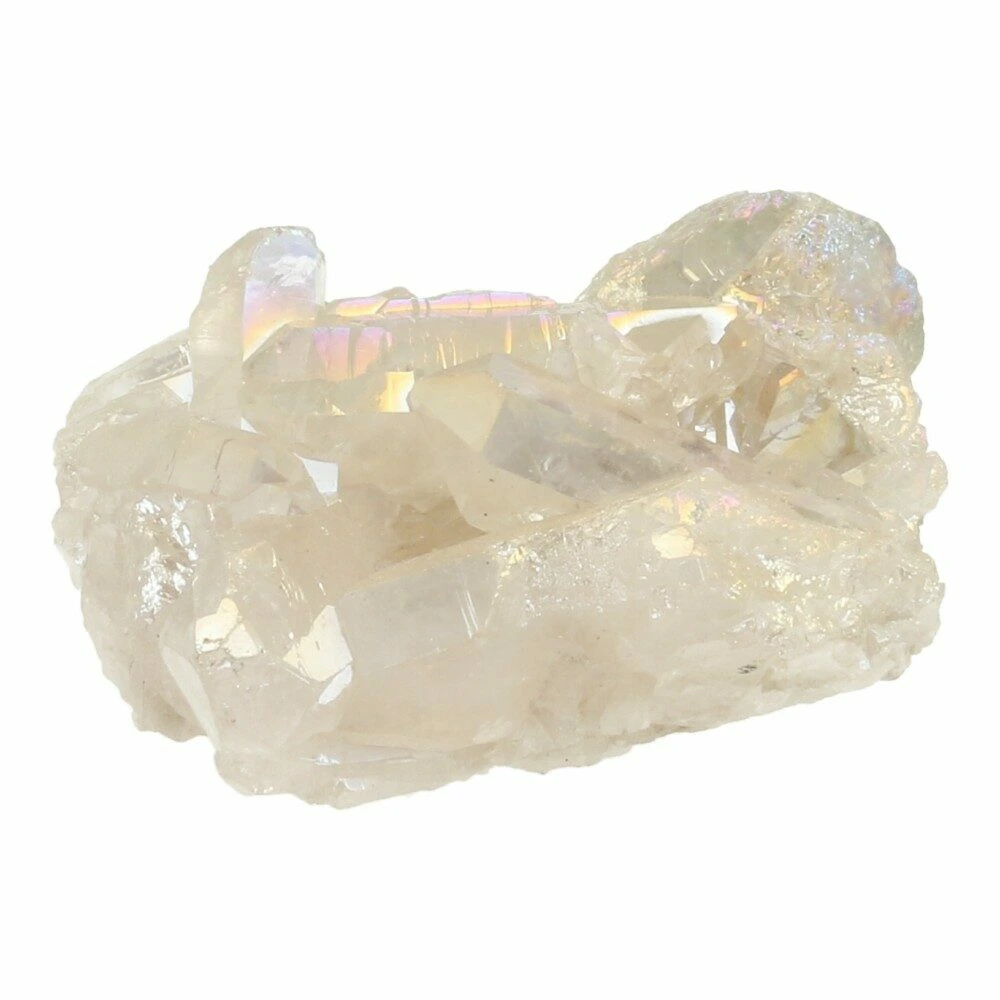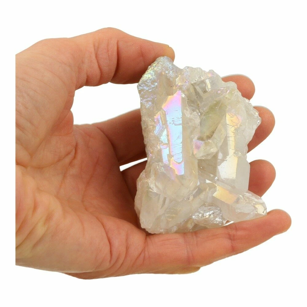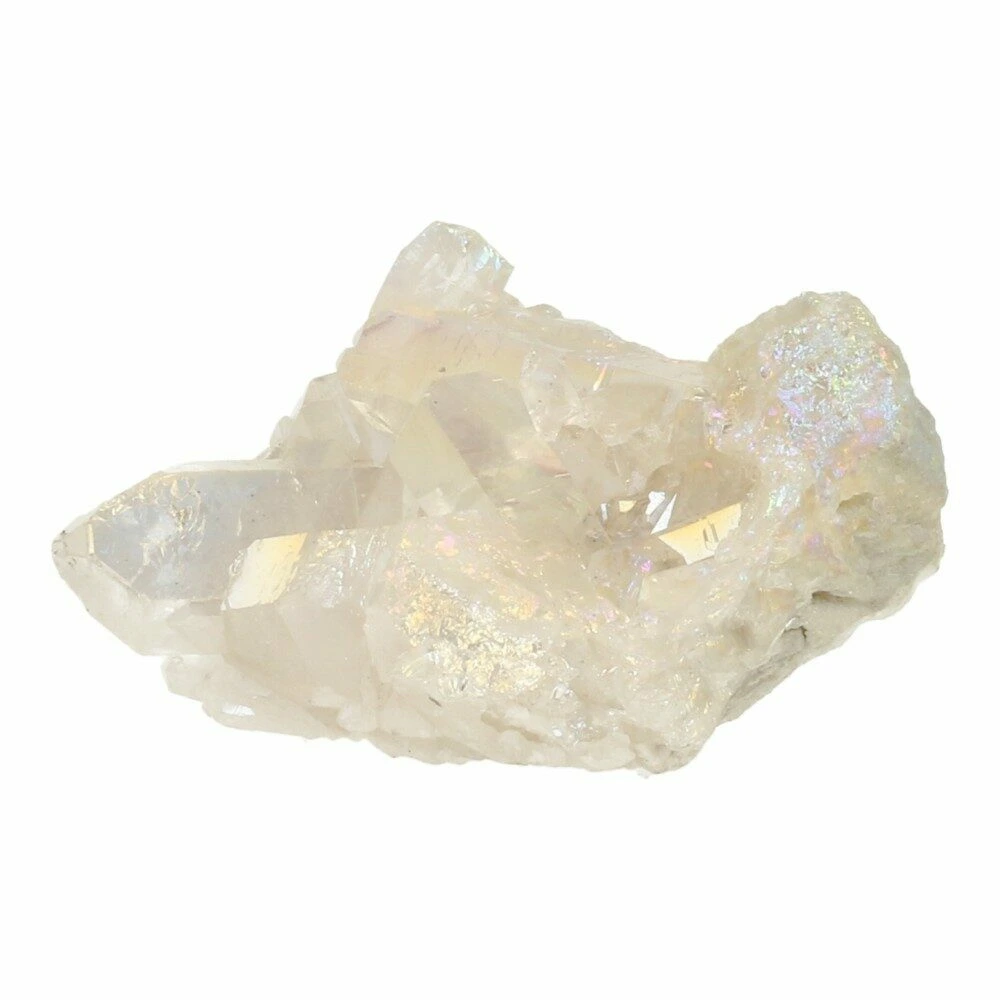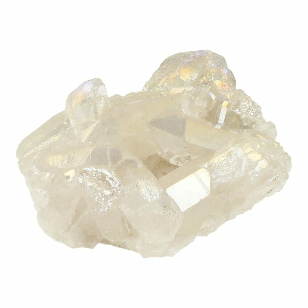 Fraai cluster angel aura ‘nr3’. Angel aura is bergkristal gecoat met zilver en platina, waardoor er een fraaie wit-olieachtige glans ontstaat. Deze in het lab gemaakte laag combineert de kwaliteiten van bergkristal met die van zilver en platina. Hieronder is de werking van bergkristal te lezen, de engelachtige glans maakt het voorkomen van dit stuk angel aura zacht en liefdevol. De afmeting is ongeveer 4cm hoog, en een basis van 7,5 x 5cm. Dit fraaie cluster heeft aan beide zijden kristallen met coating. Je ontvangt het cluster angel aura van de foto.