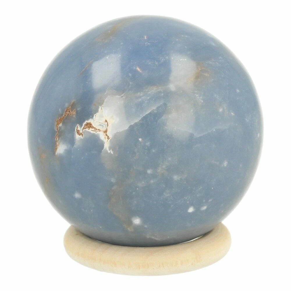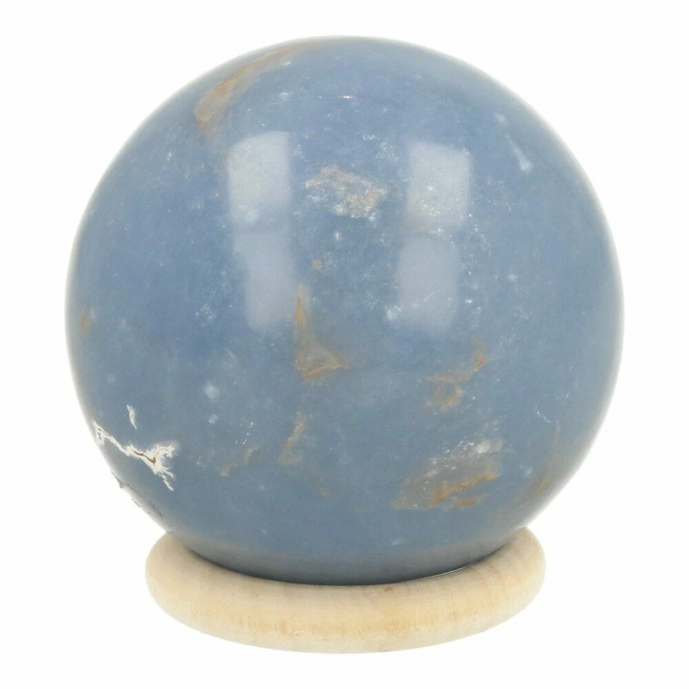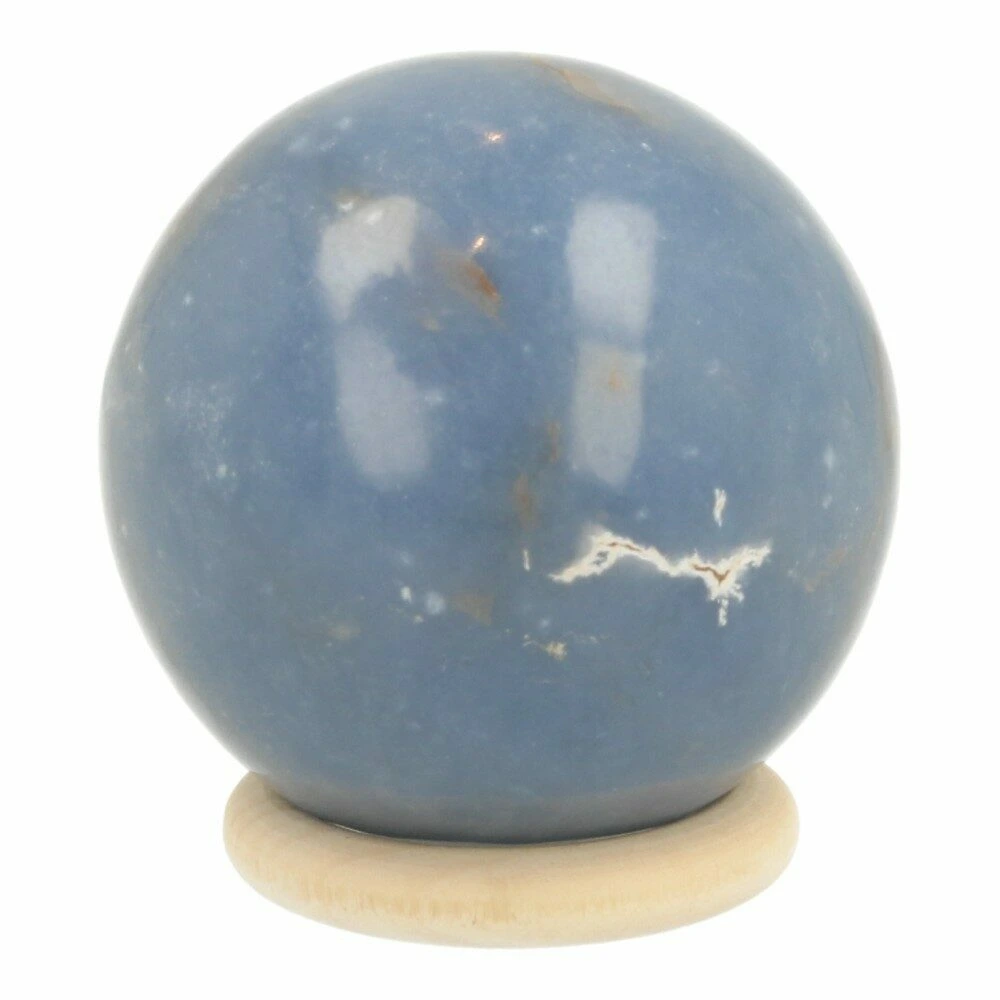 Fijne licht blauwe angeliet bol met een diameter van 47mm en houten ring uit Peru. Je ontvangt de angeliet bol van de foto.