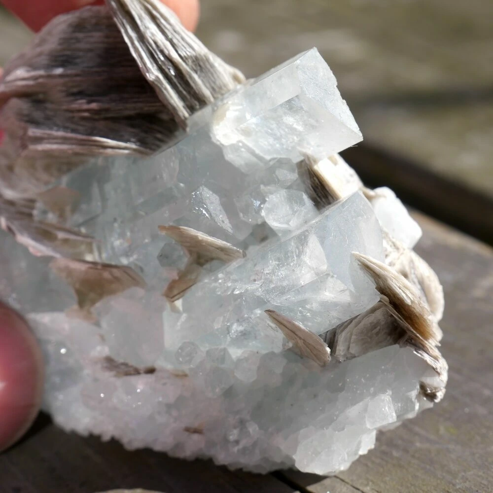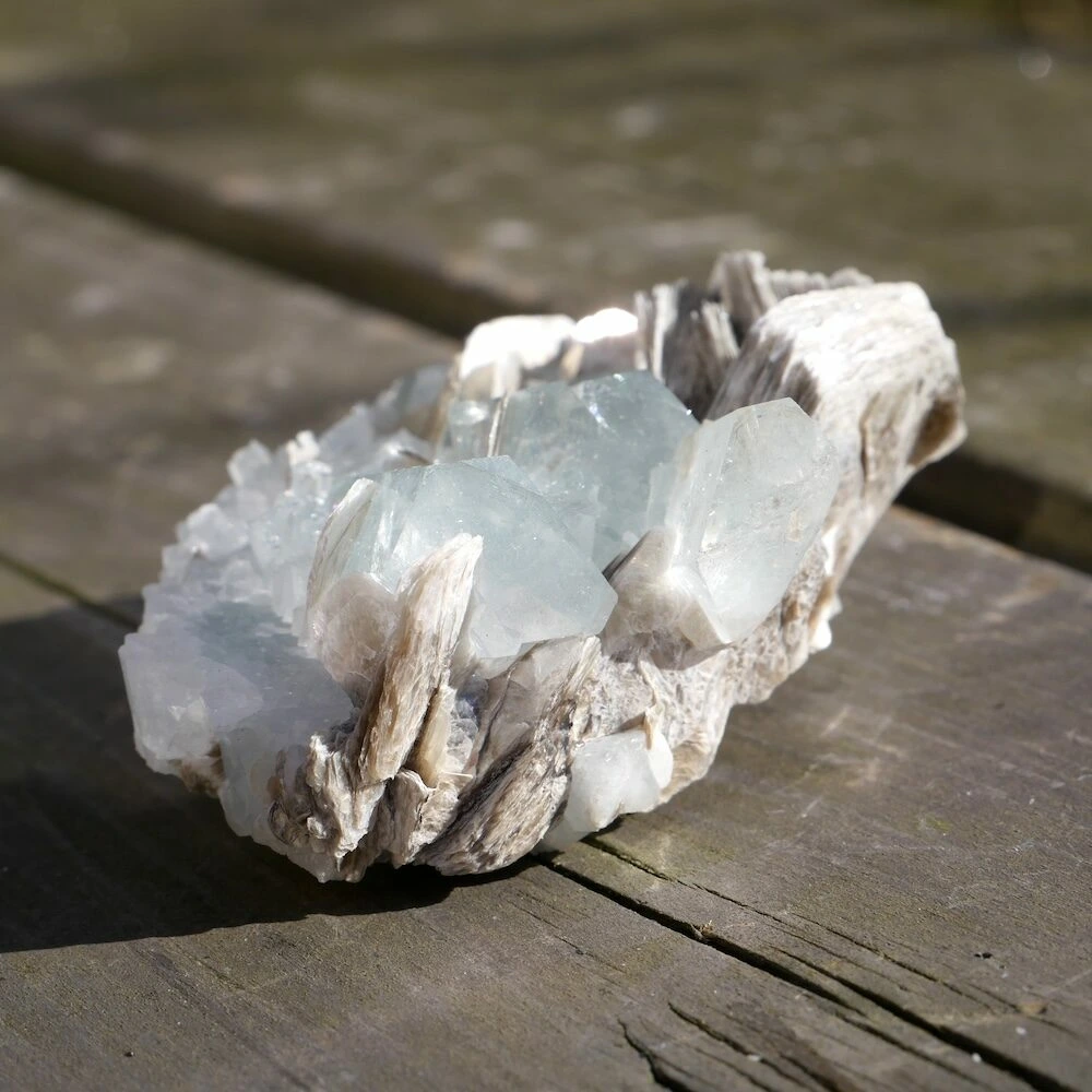 Mooi stukje van a-kwaliteit aquamarijn kristallen op muscoviet (mica). De aquamarijn kristallen zijn fraai getermineerd en hebben een esthetisch fraaie schikking. De afmetingen van dit aquamarijn cluster zijn ongeveer 65 x 51mm en 27mm hoog. Je ontvangt uiteraard deze fraaie aquamarijn van de foto.