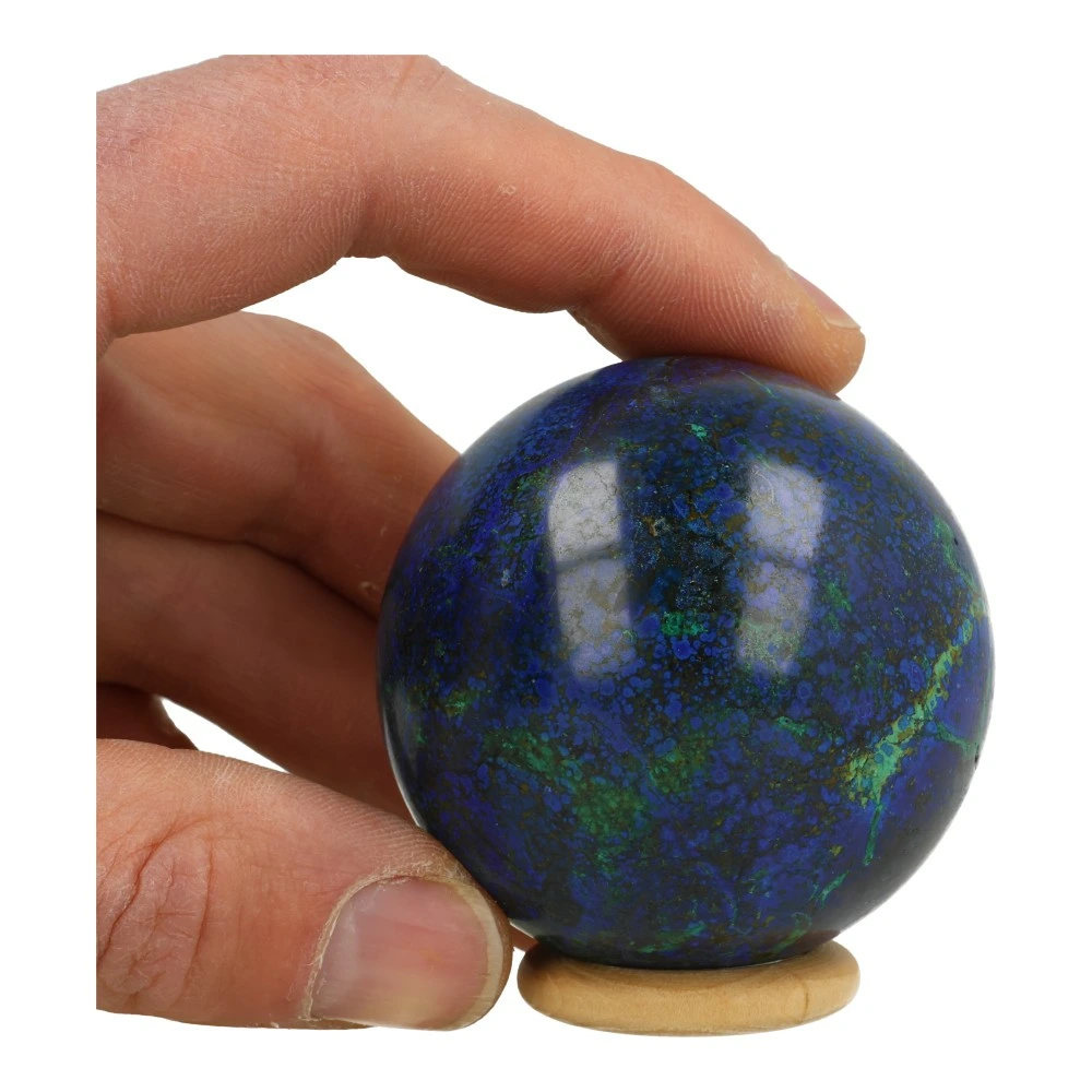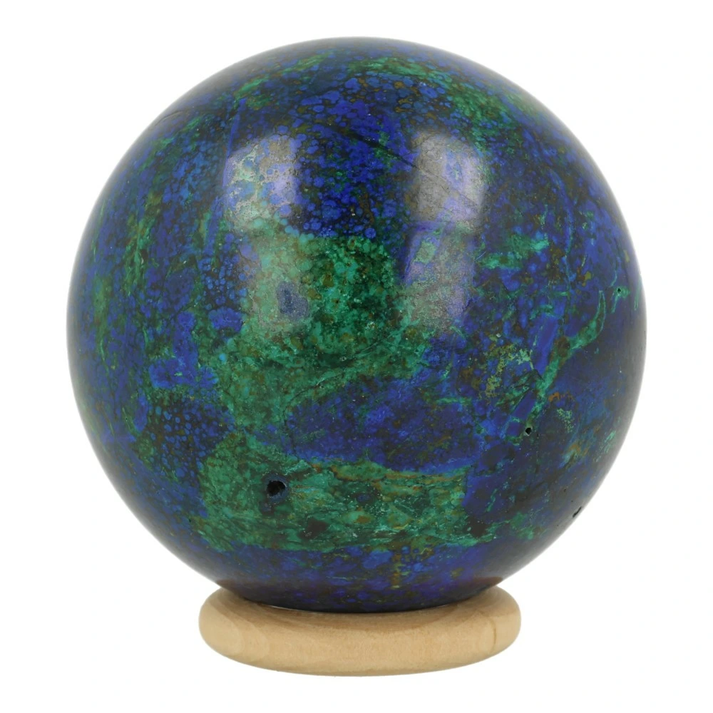 Helderblauwe A-kwaliteit azuriet met malachiet bol met diameter van circa 60mm op houten ring. Deze fraaie bol bestaat uit een mix van azuriet (donkerblauw) en malachiet (groen). Azuriet is het meeste aanwezig, dus voert de boventoon in de werking. Voor de volledigheid zijn zowel de werking van azuriet als malachiet hieronder weergegeven. Je ontvangt uiteraard de azuriet bol van de foto.