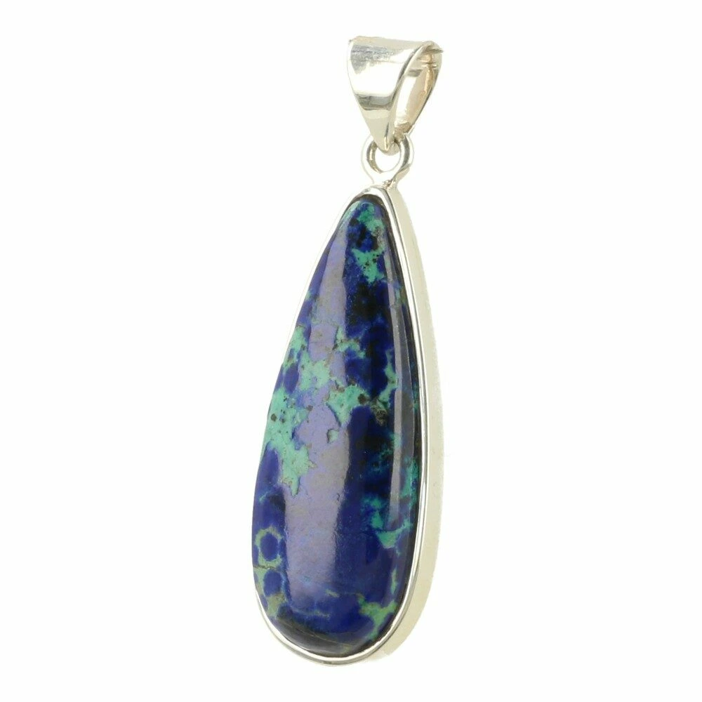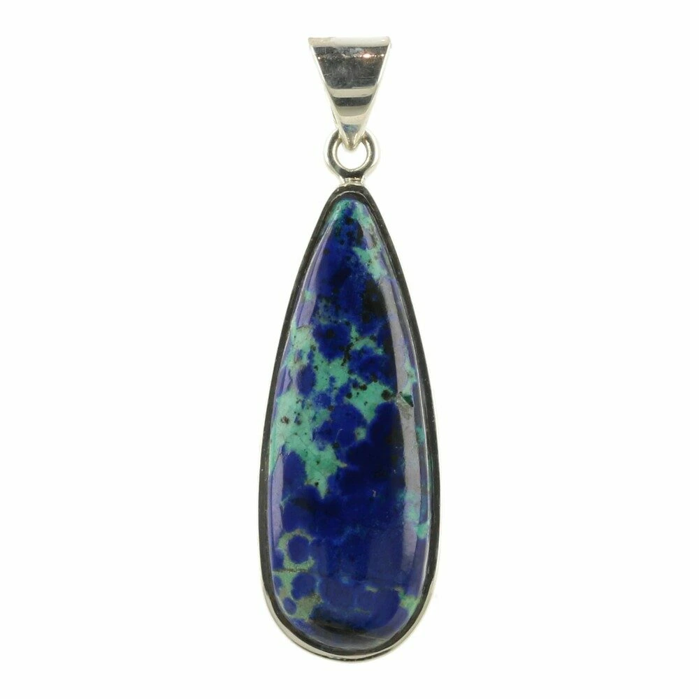 Helderblauwe A-kwaliteit azuriet met malachiet hanger in zilver van juwelierskwaliteit 925 sterling zilver. Deze fraaie hanger bestaat uit een mix van azuriet (donkerblauw) en malachiet (groen) Azuriet is het meeste aanwezig, dus voert de boventoon in de werking. Voor de volledigheid zijn zowel de werking van azuriet als malachiet hieronder weergegeven. De afmeting van de azuriet in de hanger is ongeveer 36mm hoog en 12mm breed. Je ontvangt de azuriet met malachiet hanger in zilver van de foto.