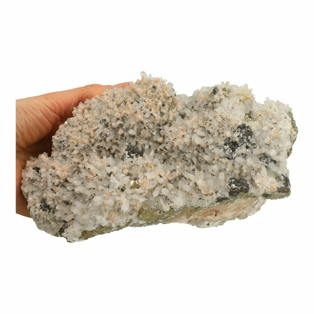 Uniek stuk ruwe bergkristal met pyriet kristallen en sfaleriet uit Peru. Dit fraaie stuk heeft een mooie compositie en grote pyriet kristallen tussen fijne bergkristal. De afmeting van dit unieke cluster is ongeveer 19 x 13,5 cm en 10cm hoog. Ongeslepen en puur natuur! Uniek door zijn vorm en fraaie aanblik van alle kanten. De energie is helder en verruimend en een aanwinst voor jouw verzameling. Topkwaliteit uit Peru, hier waren we al lang naar op zoek :-).