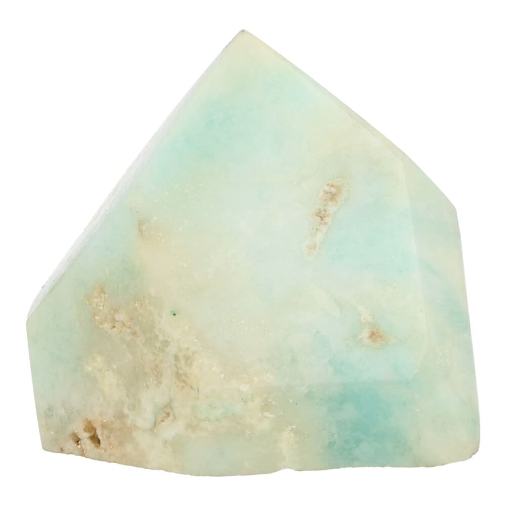 Fraaie wit met blauwe aragoniet en smithsoniet gepolijste punt uit Democratische Republiek Congo. Deze punt is ongeveer 7cm hoog en heeft een basis van 7 x 5 cm. Je ontvangt de blauwe aragoniet met smithsoniet punt van de de foto.