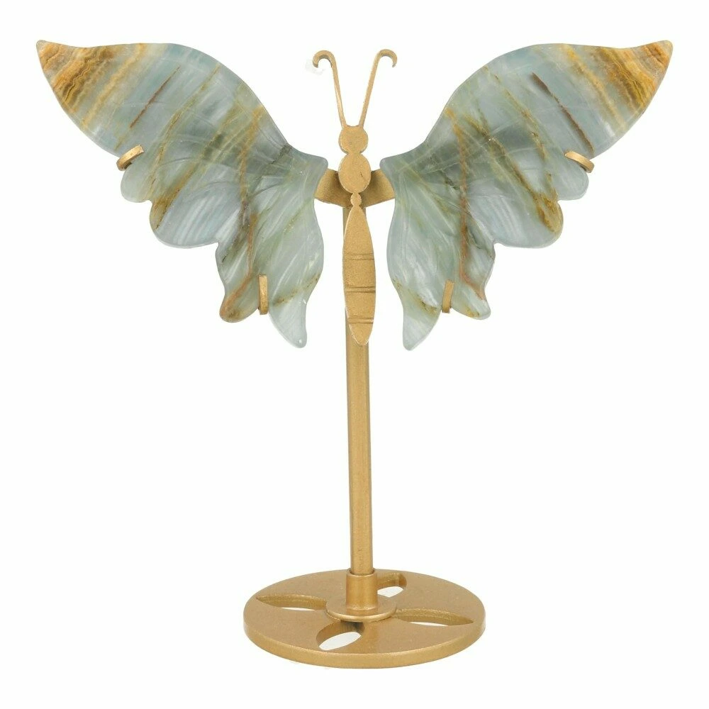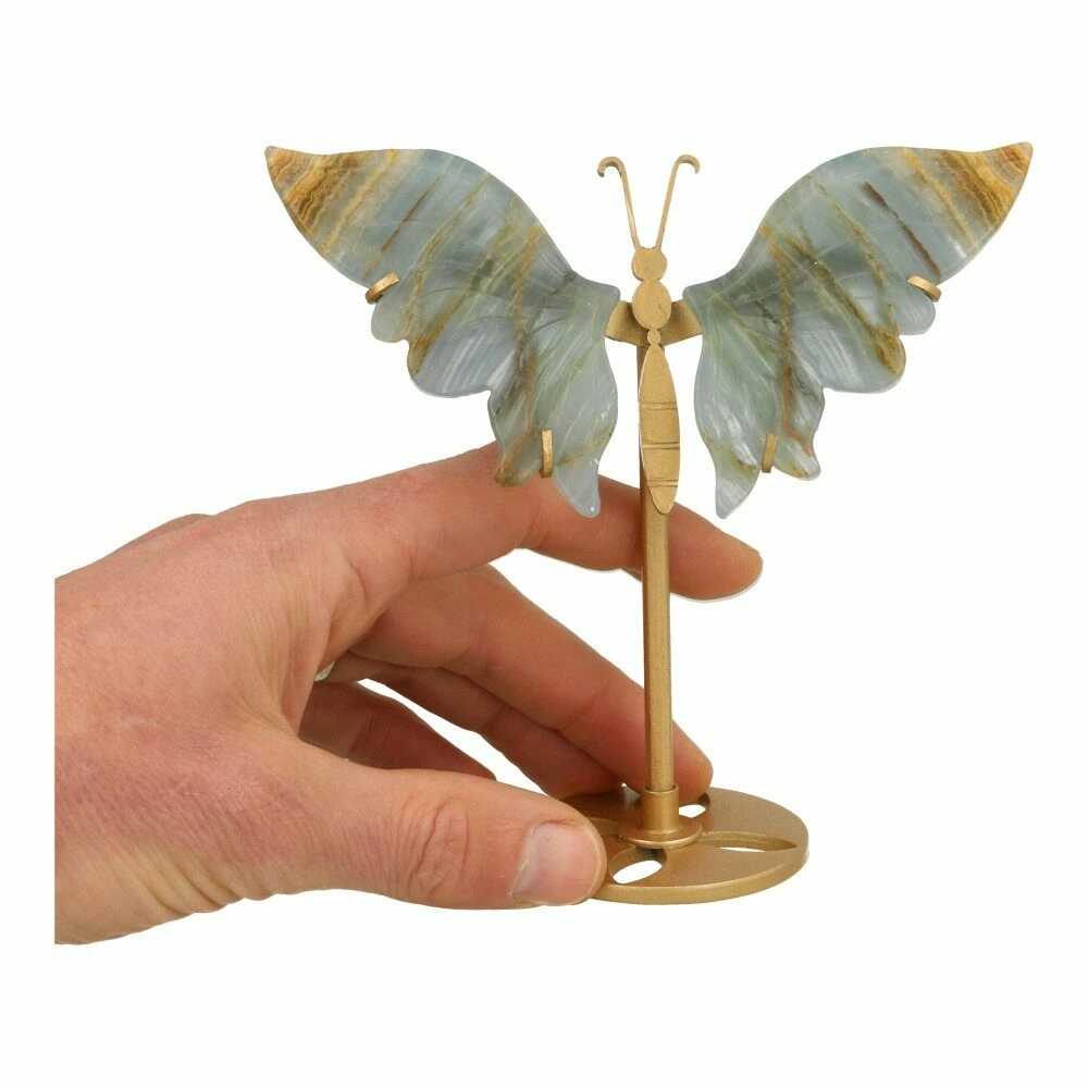 Prachtige donkere blauwe aragoniet vlinder op goudkleurige standaard ‘nr1’ uit Mexico. De spirituele naam voor deze Mexicaanse blauwe aragoniet is lemurian aquatine calciet, maar feitelijk is het hele mooie blauwe aragoniet! Fraaie vlinder met losse vleugels. De afmetingen van deze blauwe aragoniet vlinder zijn ongeveer 14,5cm breed en 14,4cm hoog. Je ontvangt deze lemurian aquatine calciet vlinder op standaard van de foto.
