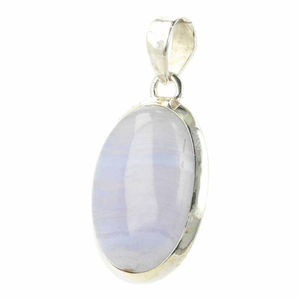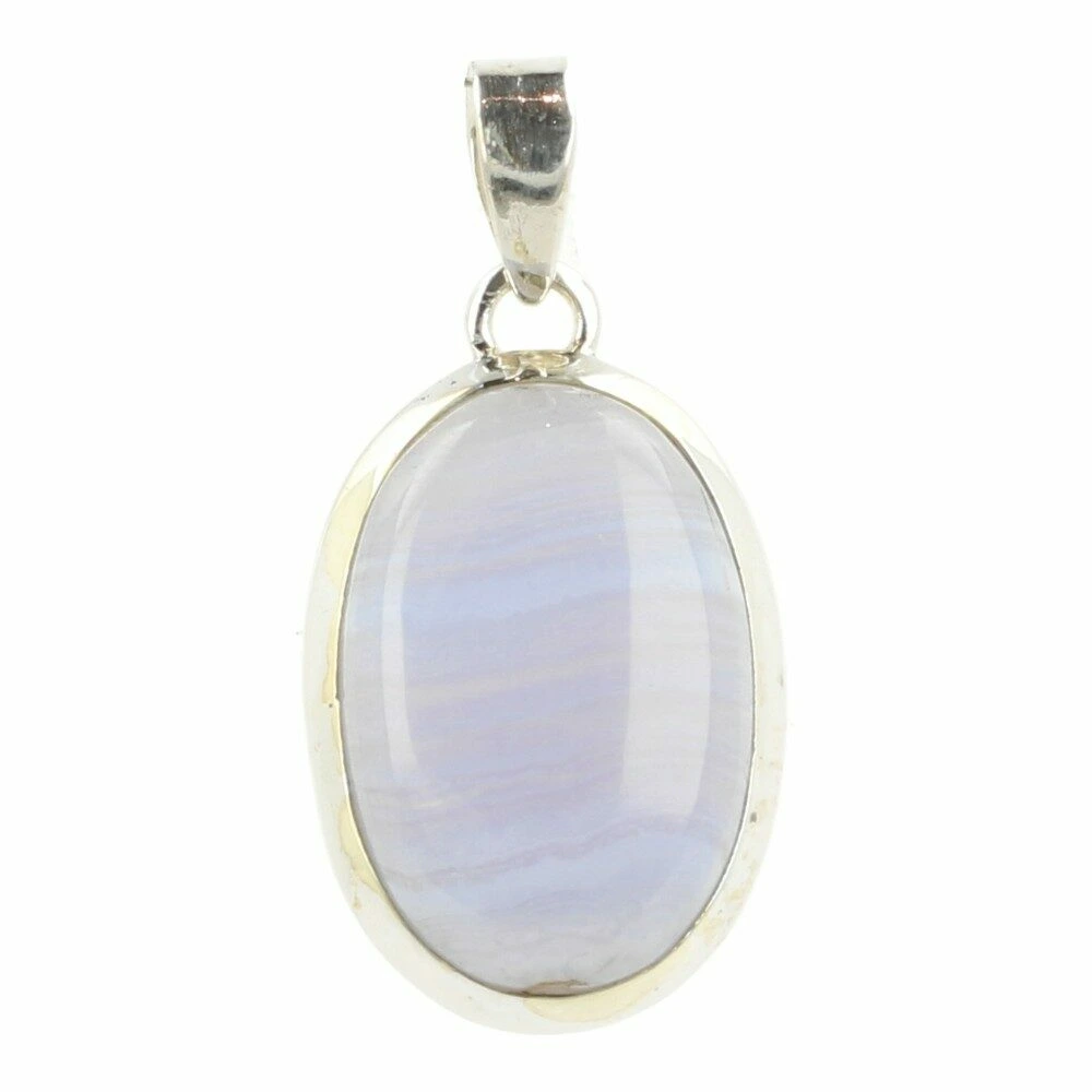 Prachtig zachte blauwe chalcedoon hanger in zilver ‘nr10’. Deze A-kwaliteit blauwe chalcedoon heeft mooie patronen en fraaie kleur en wordt ook wel blue lace agaat genoemd. De hanger is gemaakt van juwelierskwaliteit 925 sterling zilver. De afmeting van de blauwe chalcedoon in de hanger is ongeveer 25mm hoog en 17mm breed. Je ontvangt de blauwe chalcedoon hanger in zilver van de foto.