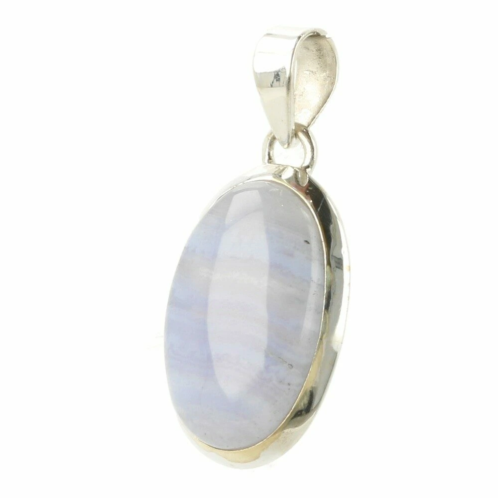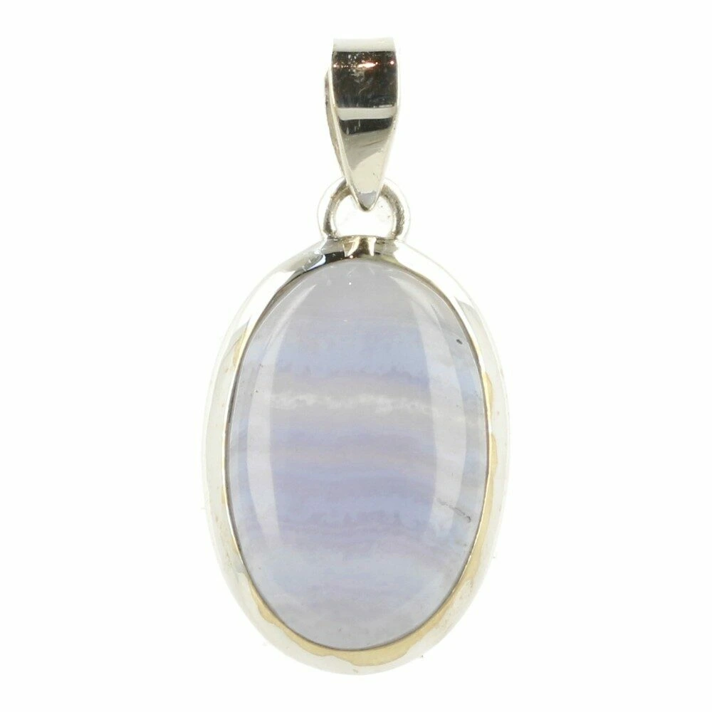Prachtig zachte blauwe chalcedoon hanger in zilver ‘nr4’. Deze A-kwaliteit blauwe chalcedoon heeft mooie patronen en fraaie kleur en wordt ook wel blue lace agaat genoemd. De hanger is gemaakt van juwelierskwaliteit 925 sterling zilver. De afmeting van de blauwe chalcedoon in de hanger is ongeveer 23mm hoog en 16mm breed. Je ontvangt de blauwe chalcedoon hanger in zilver van de foto.