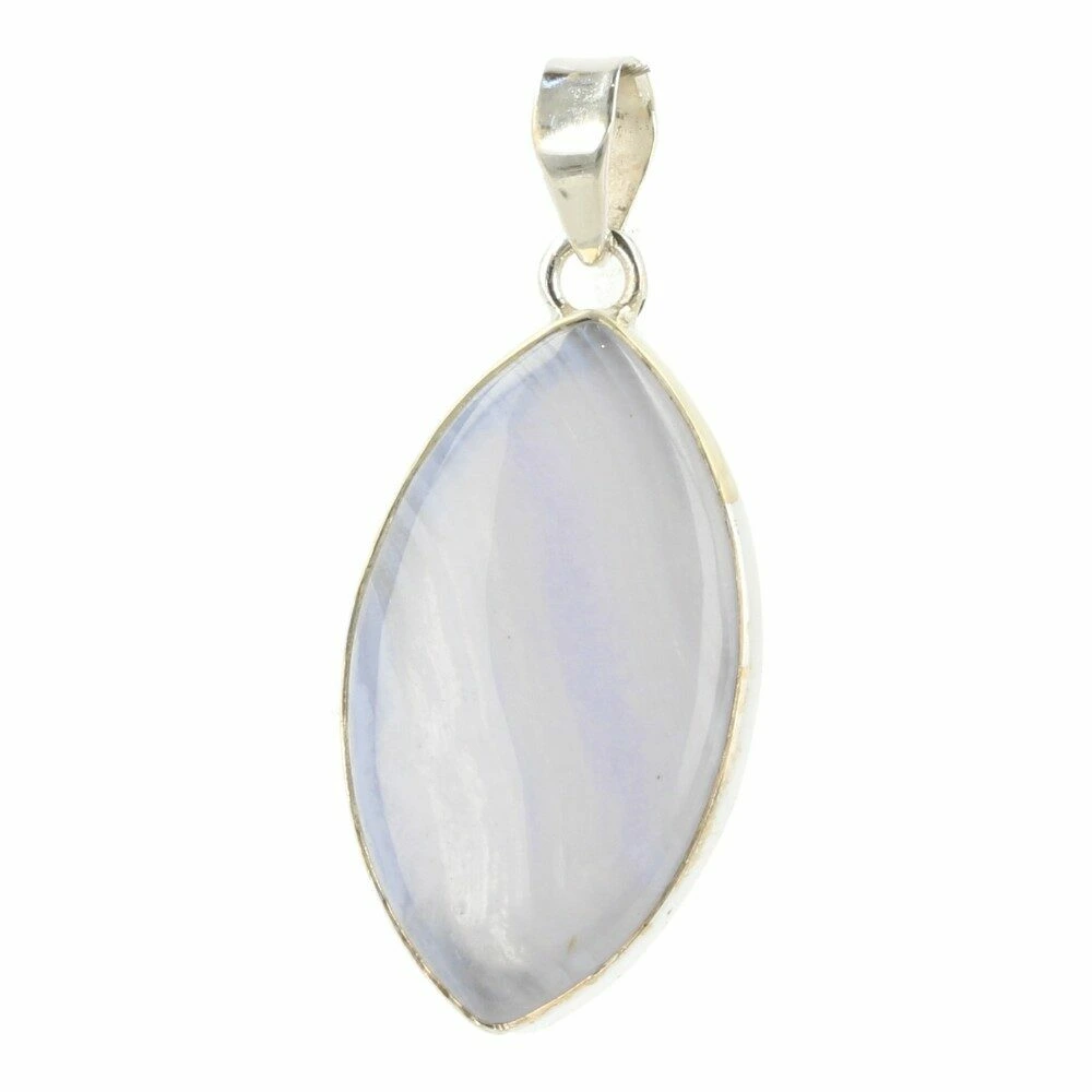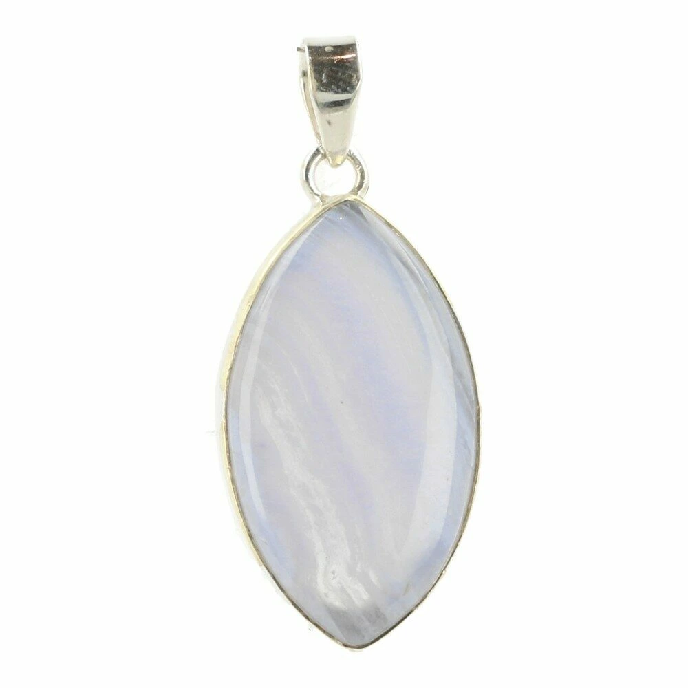Prachtig zachte blauwe chalcedoon hanger in zilver ‘nr9’. Deze A-kwaliteit blauwe chalcedoon heeft mooie patronen en fraaie kleur en wordt ook wel blue lace agaat genoemd. De hanger is gemaakt van juwelierskwaliteit 925 sterling zilver. De afmeting van de blauwe chalcedoon in de hanger is ongeveer 35mm hoog en 19mm breed. Je ontvangt de blauwe chalcedoon hanger in zilver van de foto.