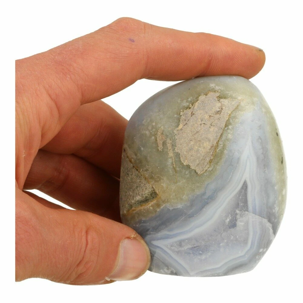 Mooie blauwe chalcedoon vrije vorm ‘nr1’ met holte en duidelijke agaatbanden. In het Engels heet blauwe chalcedoon ‘blue lace agate’. De afmeting van deze blauwe chalcedoon vrije vorm is circa 72mm hoog, 64mm breed en 44mm diep. Je ontvangt de blauwe chalcedoon gepolijste vrije vorm van de foto. Een unieke blauwe chalcedoon zoals je zeer weinig tegenkomt uit Nsanje, Malawi.