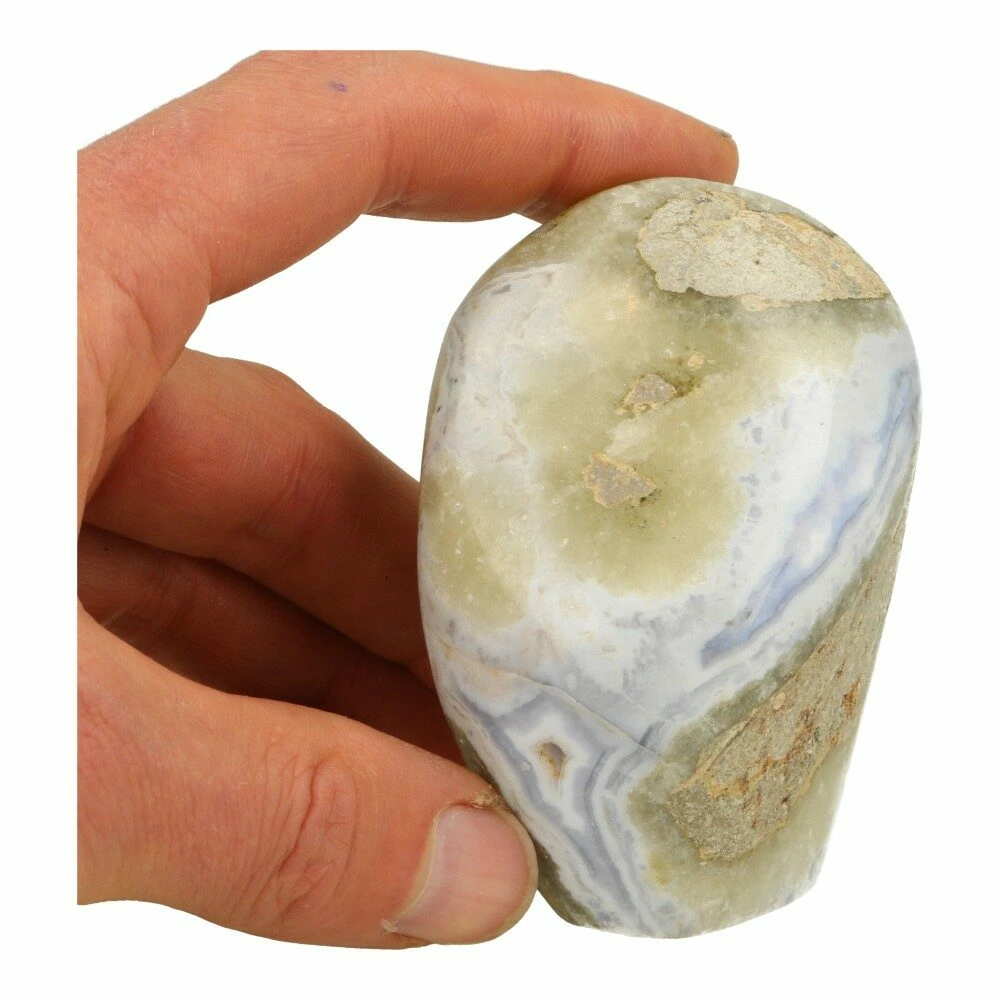 Mooie blauwe chalcedoon vrije vorm ‘nr2’ met holte en duidelijke agaatbanden. In het Engels heet blauwe chalcedoon ‘blue lace agate’. De afmeting van deze blauwe chalcedoon vrije vorm is circa 86mm hoog, 65mm breed en 48mm diep. Je ontvangt de blauwe chalcedoon gepolijste vrije vorm van de foto. Een unieke blauwe chalcedoon zoals je zeer weinig tegenkomt uit Nsanje, Malawi.