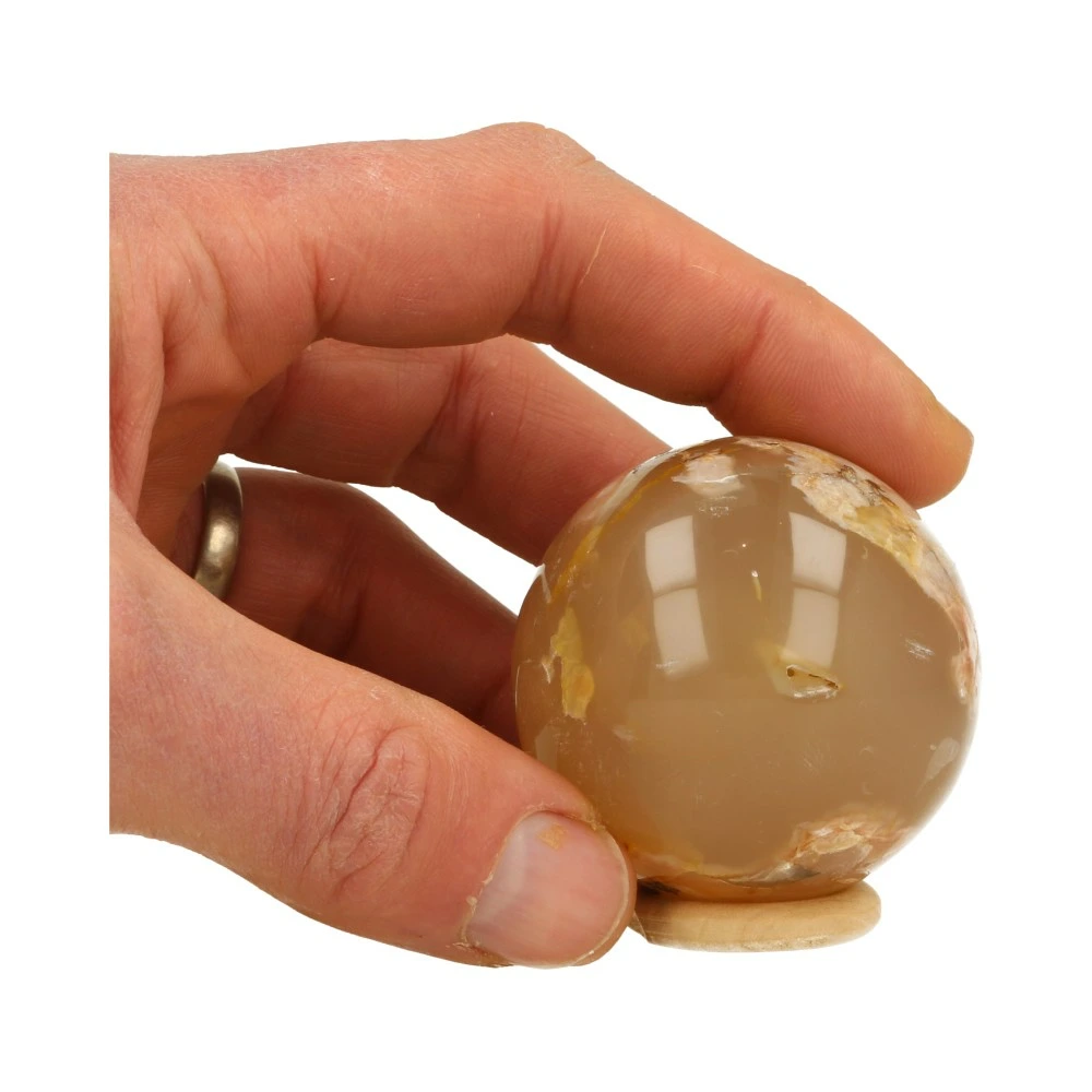 Fijne bloemagaat bol met een diameter van 53mm uit Madagaskar. Bloemagaat is de naam voor de heldere agaat met wittige vlekken. Je ontvangt de bloemagaat bol van de foto, inclusief houten ringetje.