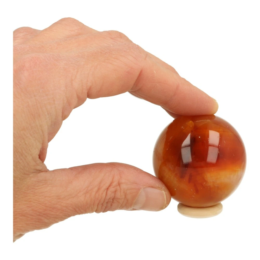 Fraai getekende carneool bol met een diameter van circa 4cm ‘nr2’. Je ontvangt de carneool bol van de foto op een houten ringetje.