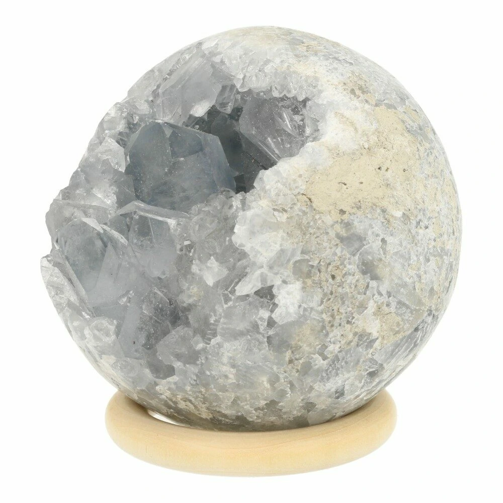 De diameter van de bol is ongeveer 9 cm, de hoogte van de onderzijde tot de ruwe bovenkant is ongeveer 8cm. Je ontvangt de celestien bol van de foto met houten ring.