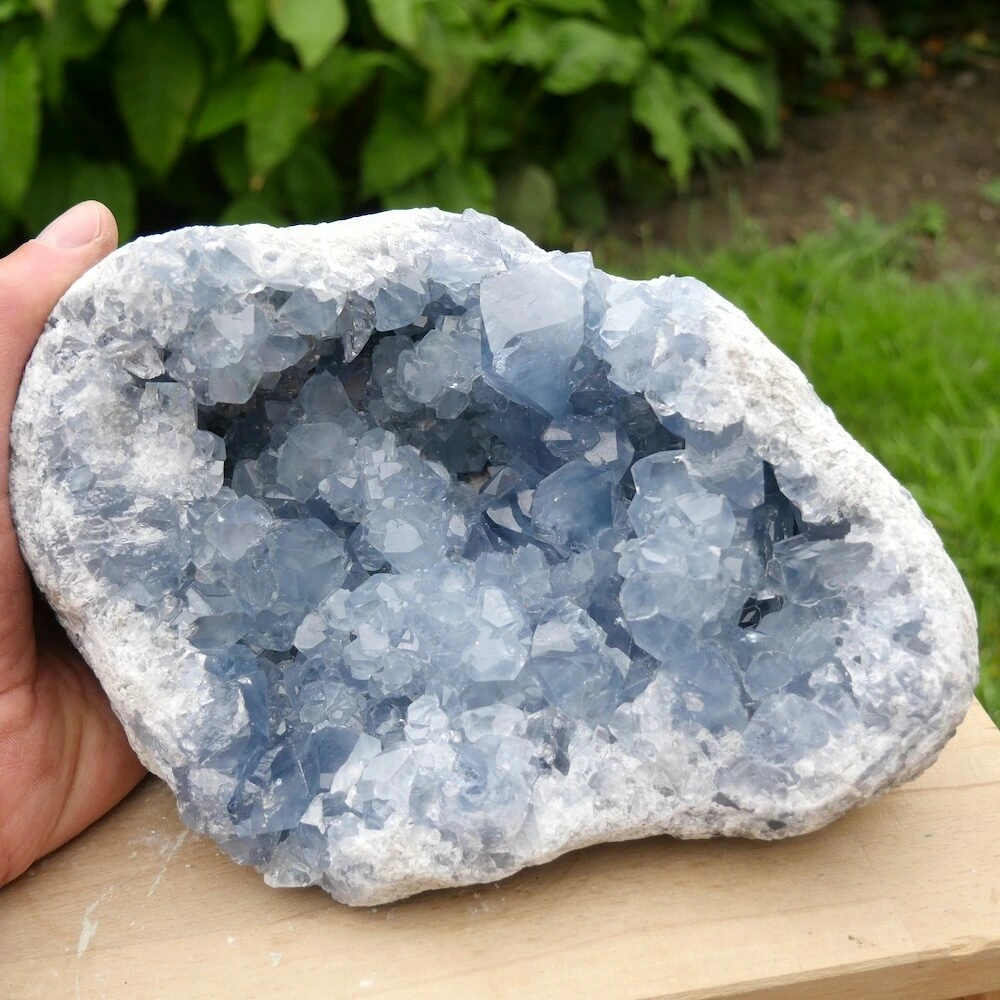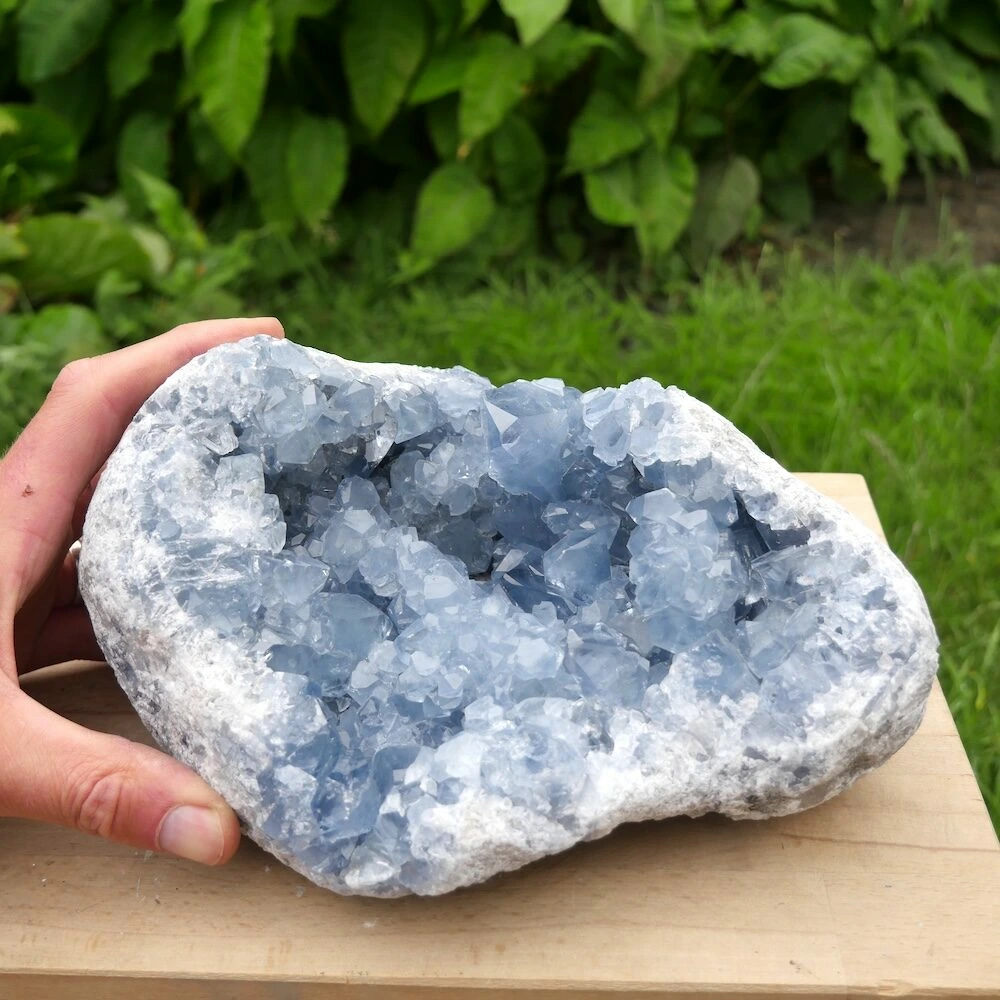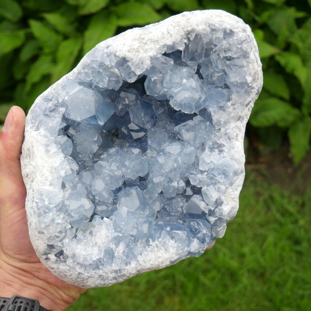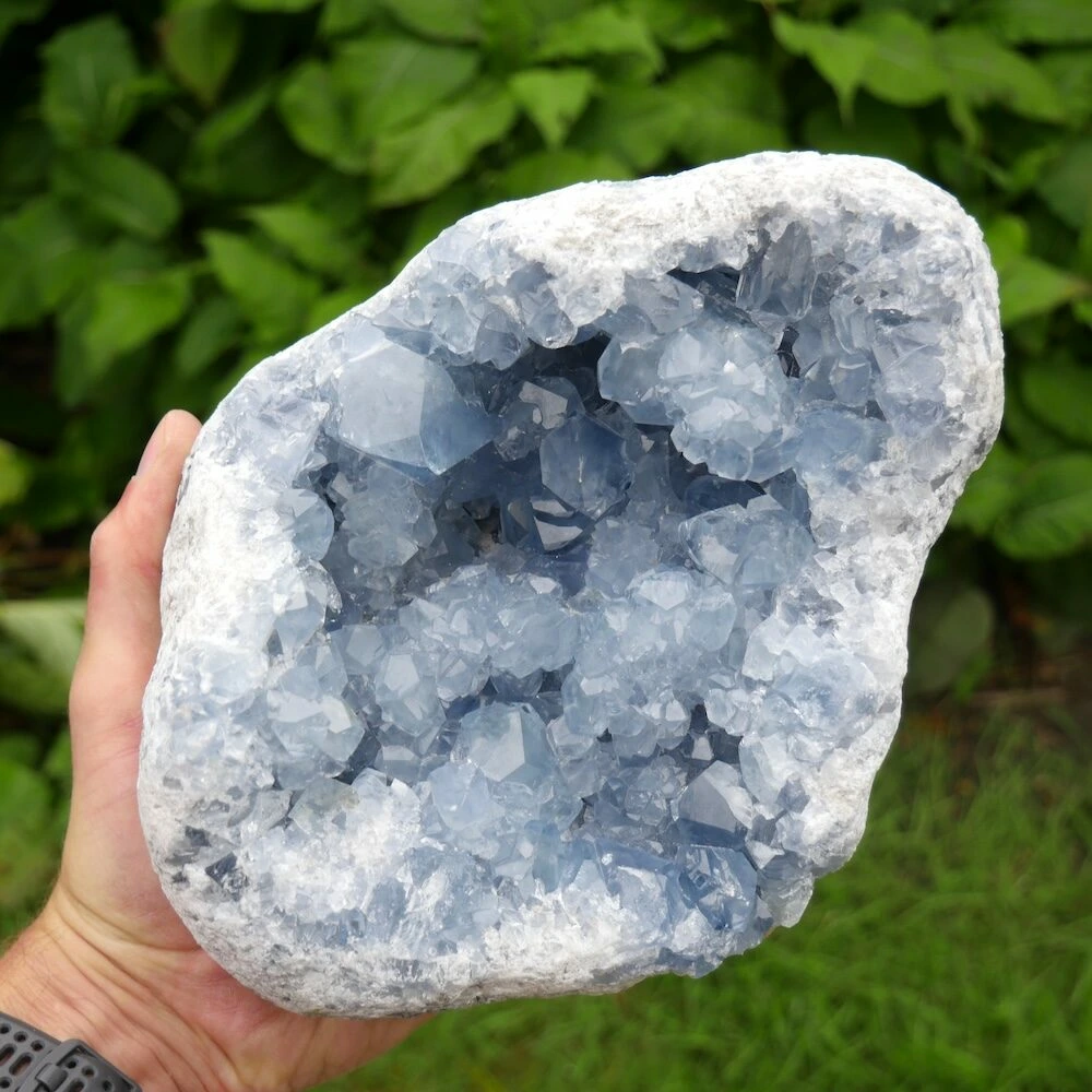 Topkwaliteit celestien geode met heldere kristallen en een gewicht van 5,8kg uit Madagaskar, hoge kwaliteit zonder beschadigingen. De energie van dit stuk is speels en zacht, perfect voor meer gevoelige mensen. Ze nodigt je uit om ontspannen je bewustzijn te vergroten en te genieten van de ondersteuning vanuit de energiewereld. Een fijne steen voor bv een slaap- of kinderkamer, maar ook zeer geschikt in bv praktijkruimtes om de ontspanning er in te houden. Deze fraaie geode kan mooi zelfstandig liggen, bestel een standaard groot om deze geode op andere manieren neer te zetten.
