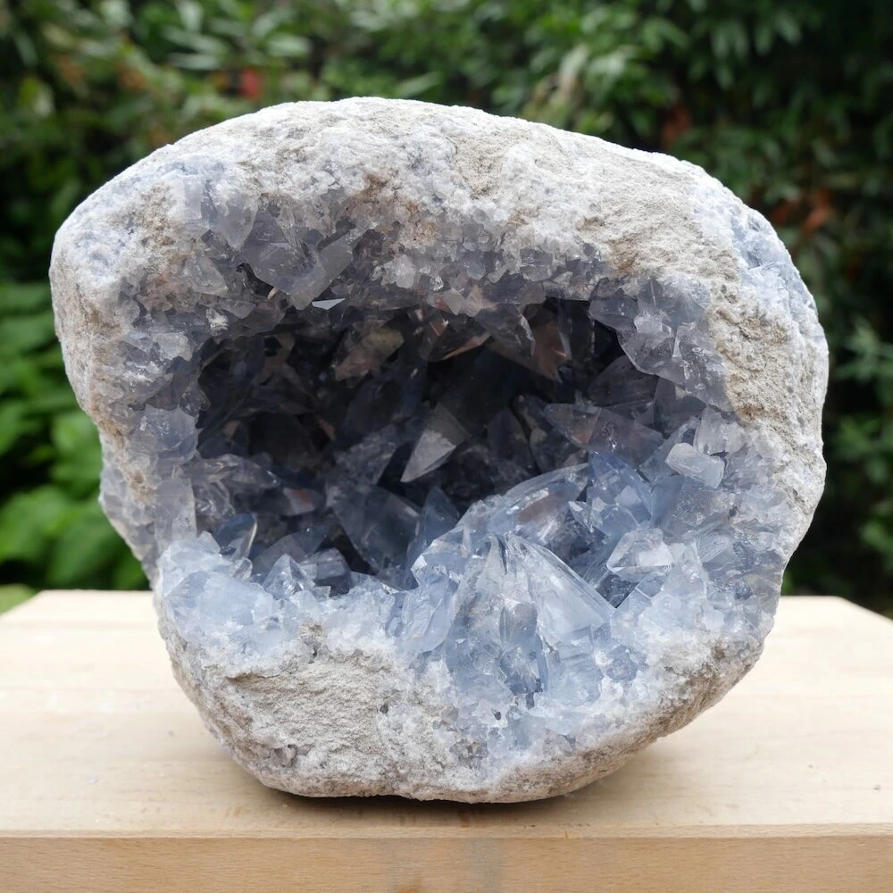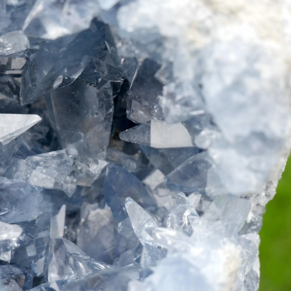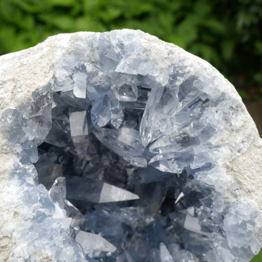 Topkwaliteit celestien geode met heldere kristallen en een gewicht van 5,8kg uit Madagaskar, hoge kwaliteit zonder beschadigingen en met fraaie spitse kristallen. De energie van dit stuk is helder en fris, perfect voor meer gevoelige mensen. Ze nodigt je uit om in jouw eigen heldere energie te zijn, jouw licht is immers je beste bescherming. Een prachtige celestien geode om te stralen in jouw ruimte. Deze fraaie geode kan mooi zelfstandig liggen, bestel een standaard groot om deze geode op andere manieren neer te zetten.