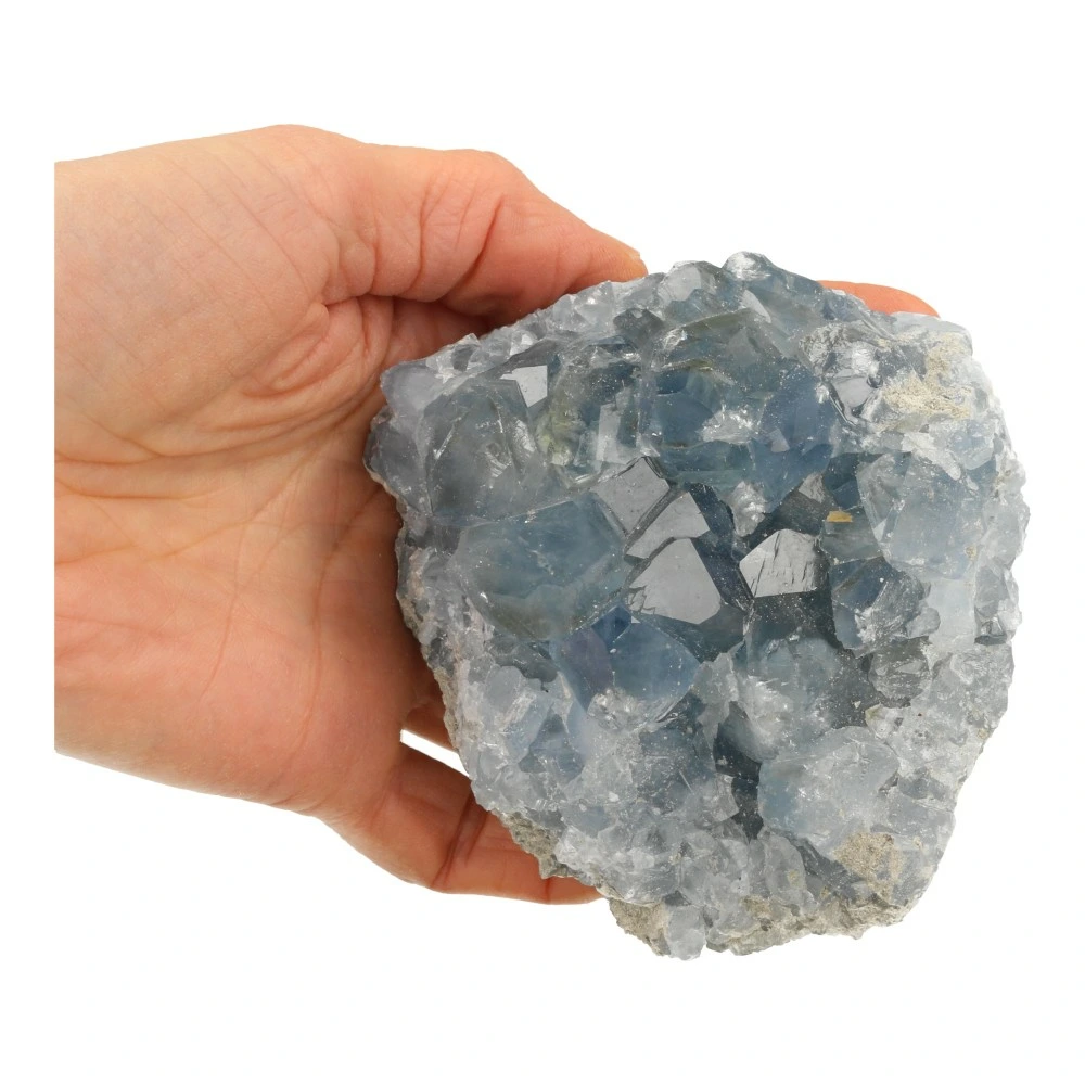 De afmeting van dit stuk is ongeveer 10cm lang en 8,5 cm breed en 5 cm hoog. Zoek je een ander stuk? Neem contact met ons op, want we hebben een steeds wisselende voorraad mooie celestien clusters!