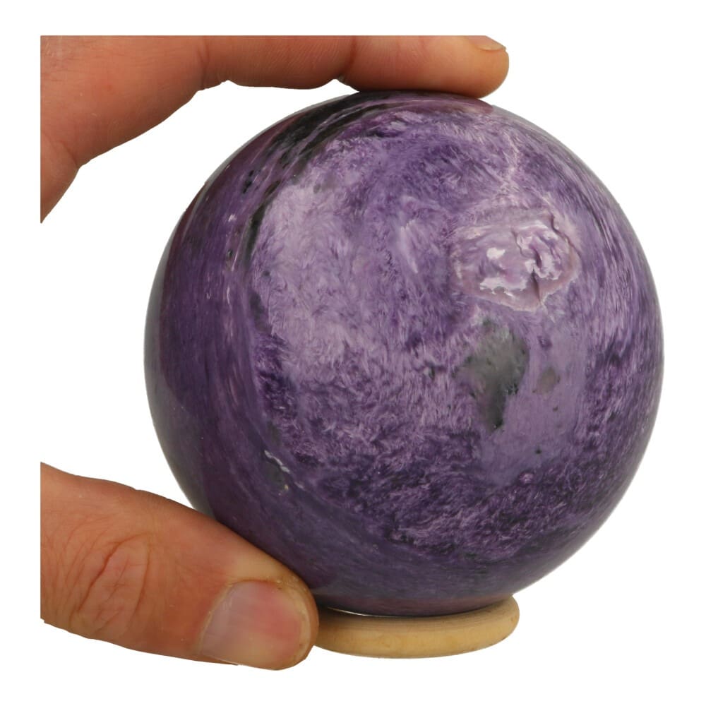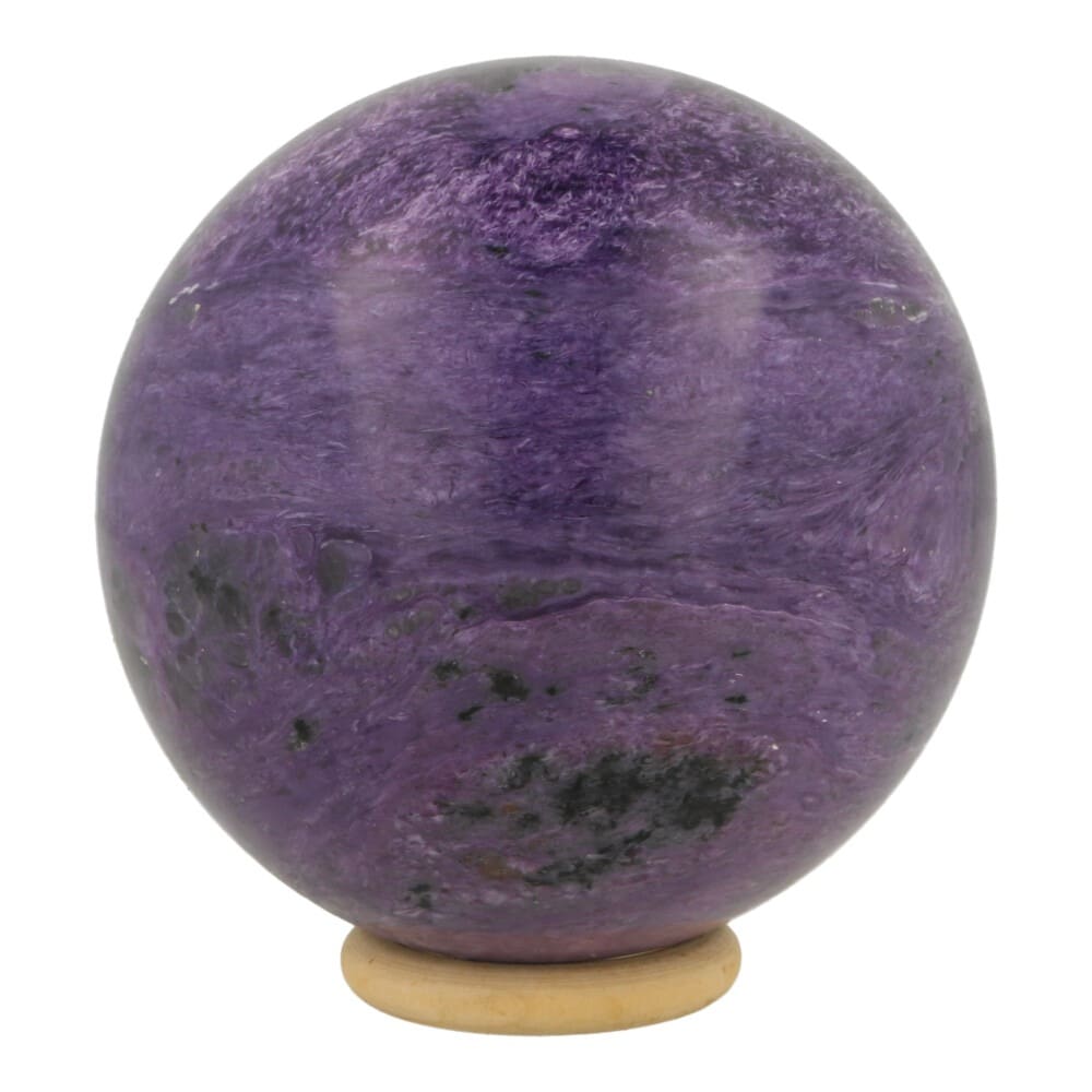 Prachtig gemelleerd paarse charoiet bol van 88mm in AA-kwaliteit. Werkelijk prachtige bol met veel paarse structuur en weinig zwart uit Rusland. Je ontvangt deze prachtige bol van de foto met houten ring. Een uniek exemplaar van prachtige kwaliteit!