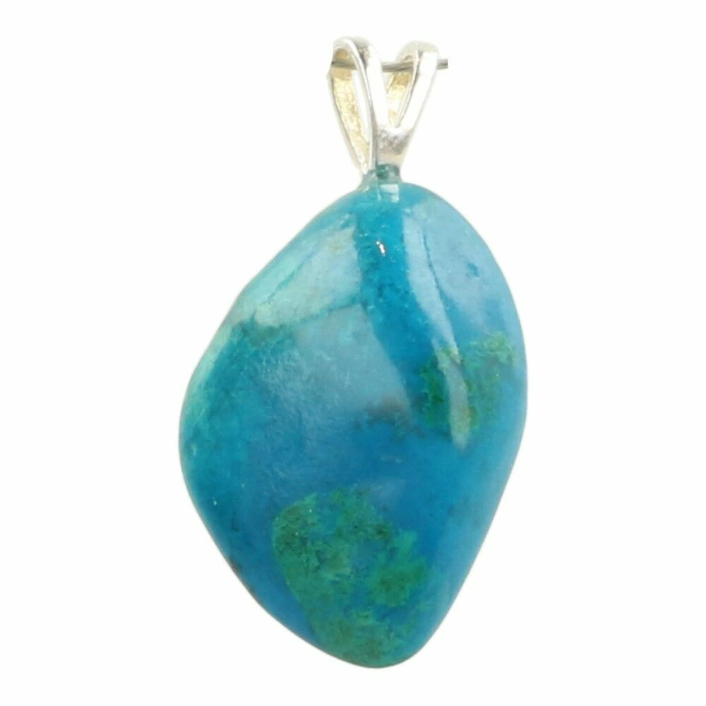 Prachtige chrysocolla hanger met zilveren oogje. Hoge kwaliteit ‘gezondheidshanger’ die mooi staat aan een zilveren ketting. Je ontvangt een soortgelijke chrysocolla hanger als op de foto, zonder koordje. De afmeting van de hanger is ongeveer 1,5-2cm breed en 1,5 – 2cm hoog.