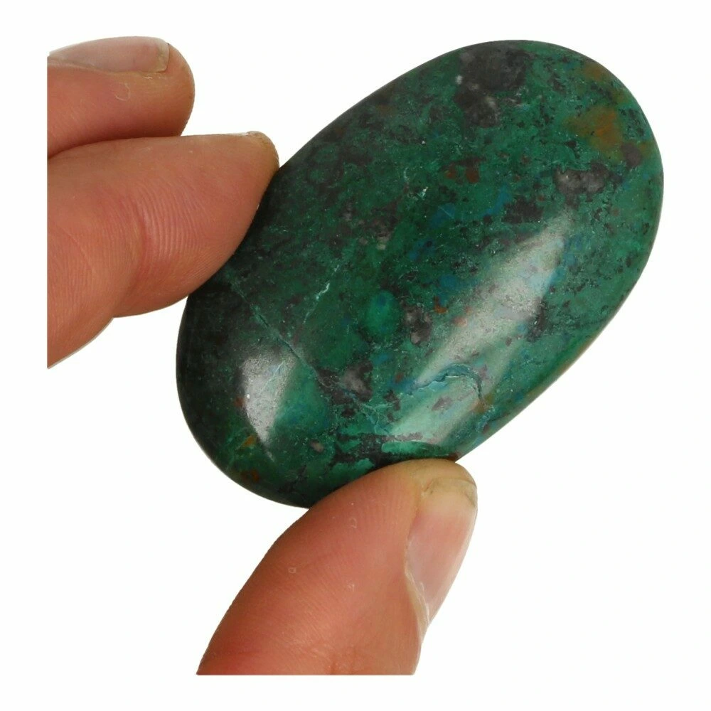Prachtige chrysocolla knuffelsteen met een afmeting van circa 4,5-5,5cm lang, 3,5-4cm breed en 2cm dik. Je ontvangt een soortgelijke chrysocolla knuffelsteen als op de foto. Prachtige kwaliteit uit Peru, uniek!
