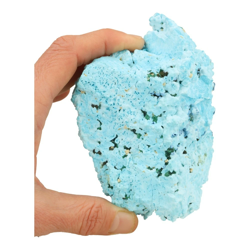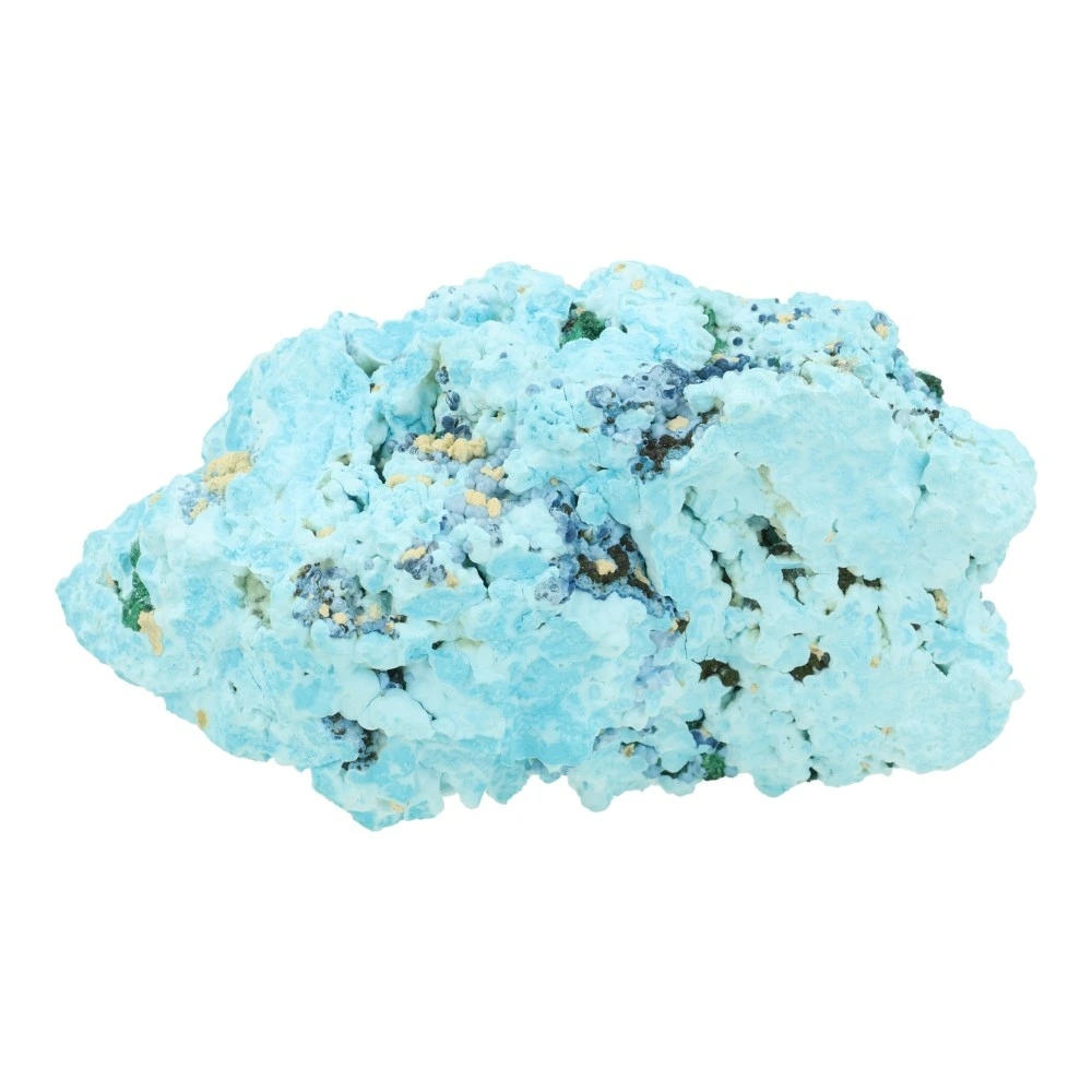 Prachtige chrysocolla ruw groot met een afmeting van circa 12cm breed, 7,8cm diep en 7cm hoog uit Democratische Republiek Congo. Dit fraaie stuk met bizar heldere kleuren is puur natuur en bevat een groot deel groene malachiet in fluwelen streepjes en donkerblauwe shattuckiet kristallen. Een lichtgewicht stuk met interessante holtes en van iedere zijde anders om te zien.