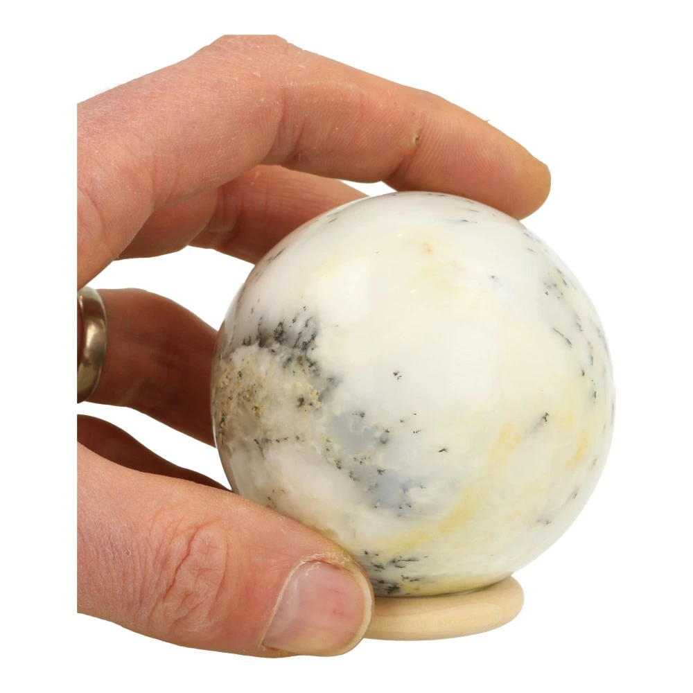 Fijne lichte dendriet opaal bol met een diameter van circa 71mm en houten ring. Mooie bol om zachte transformatie te bevorderen. Dendriet opaal is een witte edelsteen met grijs-zwarte aders. Je ontvangt de dendriet opaal bol van de foto.