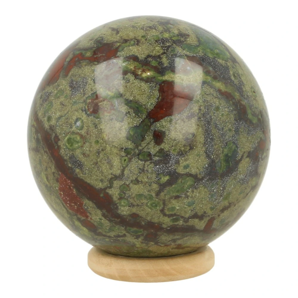 Fraai getekende drakenbloedsteen bol met diameter van circa 56mm op houten ring. Drakenbloedsteen heet ook wel Dragon Stone in het Engels. Je ontvangt de drakenbloedsteen bol van de foto.