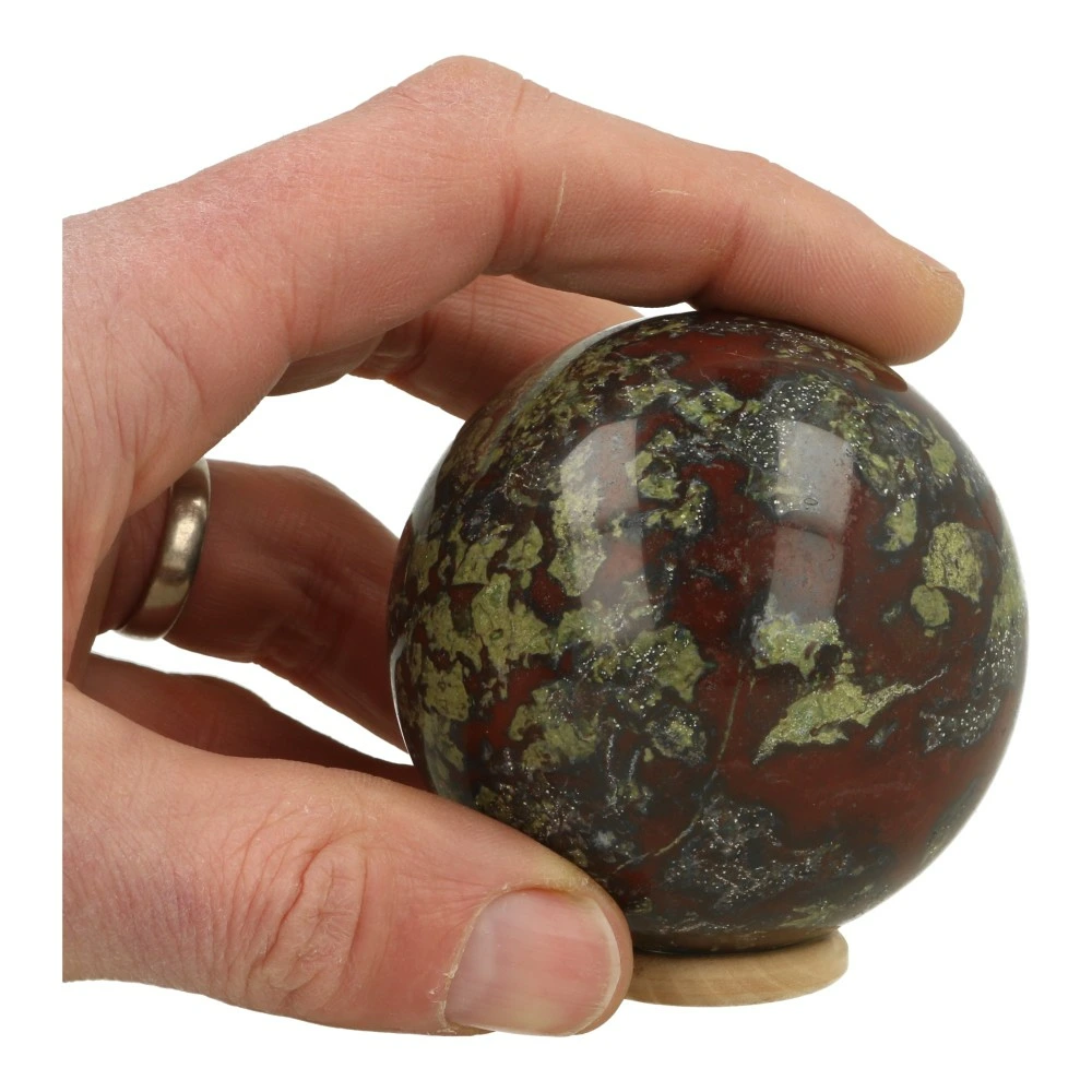 Fraai getekende drakenbloedsteen bol met diameter van circa 68mm op houten ring. Drakenbloedsteen heet ook wel Dragon Stone in het Engels. Je ontvangt de drakenbloedsteen bol van de foto.