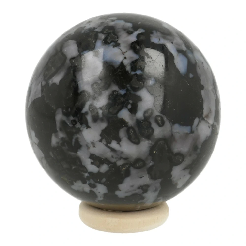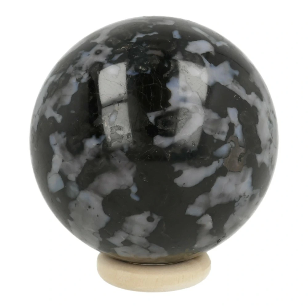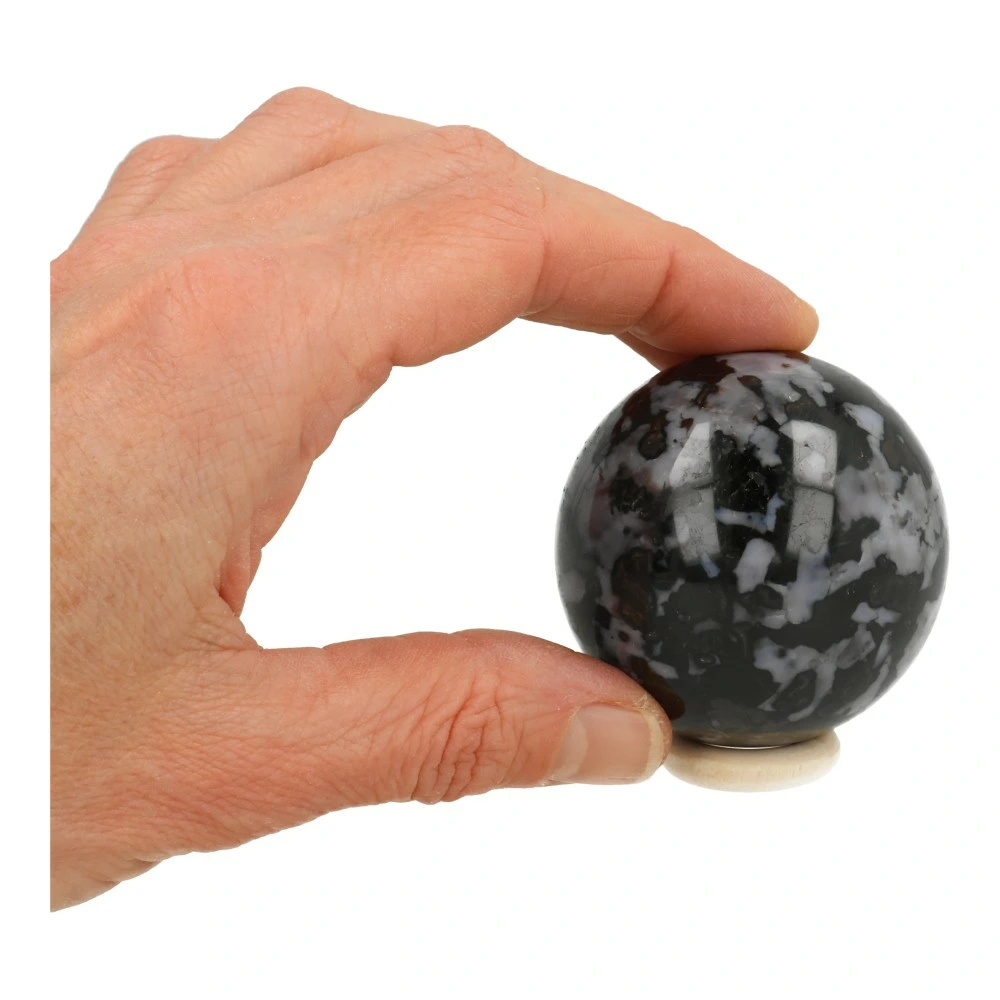 Mooie gabbro bol, ook wel mystiek merliniet genoemd, met een frisse energie. Deze fijne bol heeft een diameter van circa 53mm met mooie glimvlakken. Je ontvangt de bol van de foto met houten ringetje.