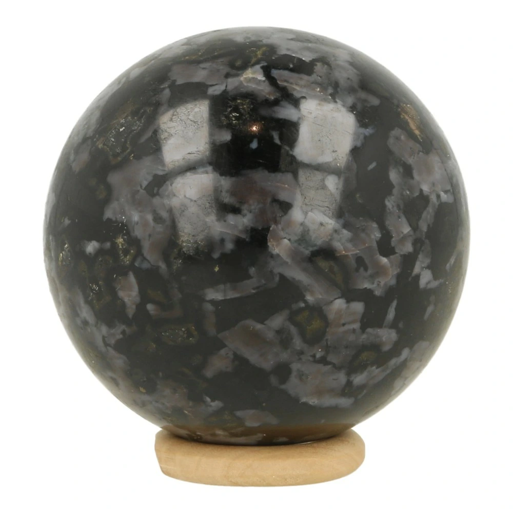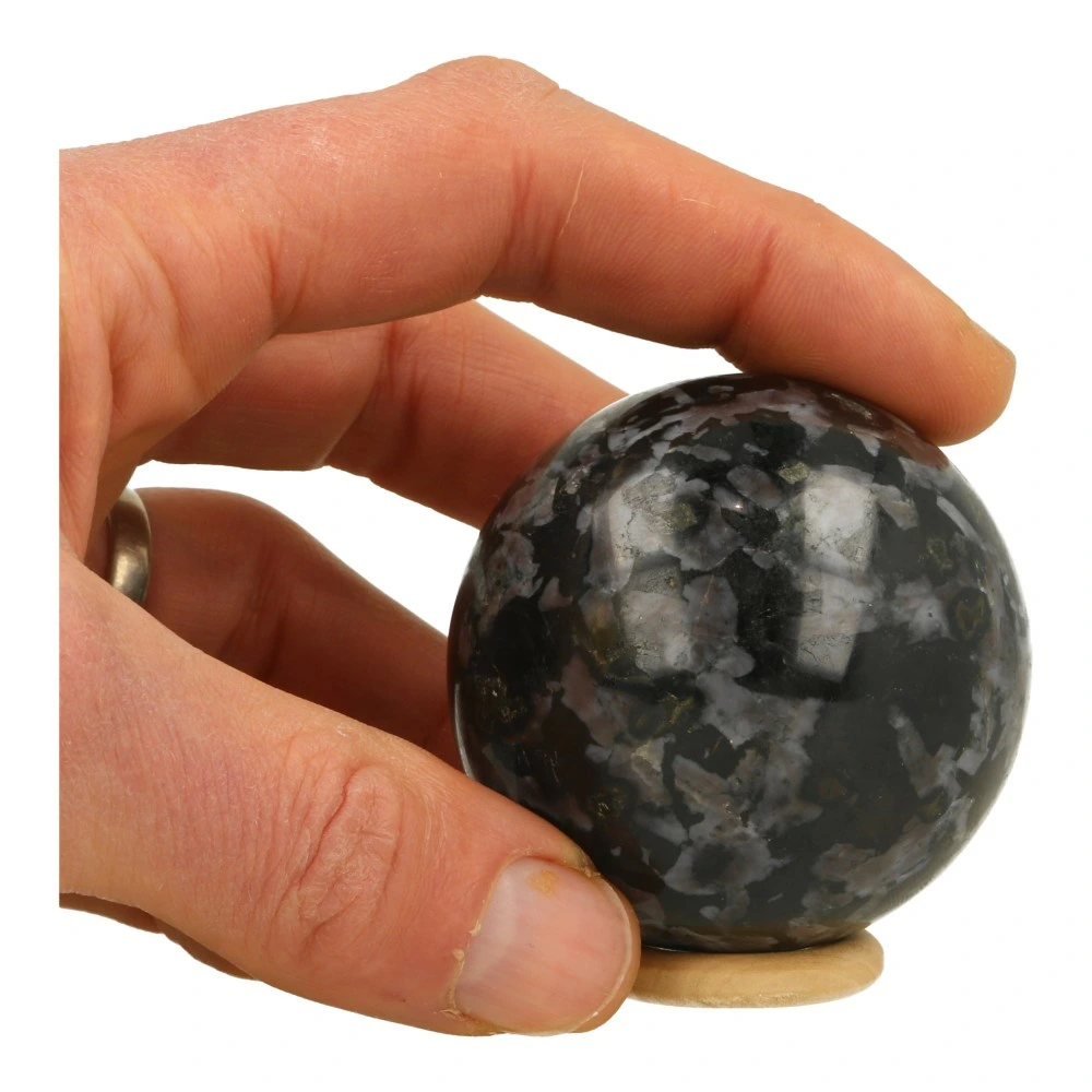 Mooi formaat gabbro bol, ook wel mystiek merliniet genoemd, met een diepe, gelaagde werking. Deze fijne bol heeft een diameter van circa 58mm. Je ontvangt de bol van de foto met houten ringetje.