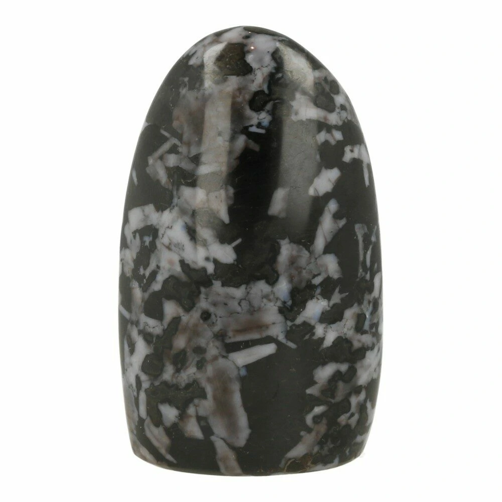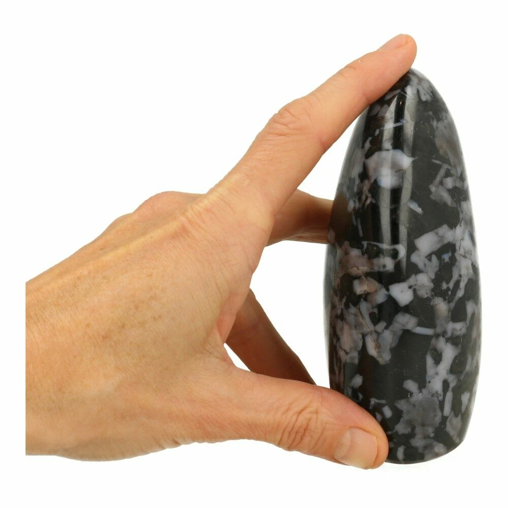 Mooi formaat gabbro vrije vorm met een frisse en gefocuste energie. De afmetingen van deze gepolijste gabbro of merliniet is circa 125mm hoog, 75mm breed en 52mm dik. Je ontvangt de gabbro vrije vorm van de foto. Gabbro staat ook bekend als ‘mystiek merliniet’.