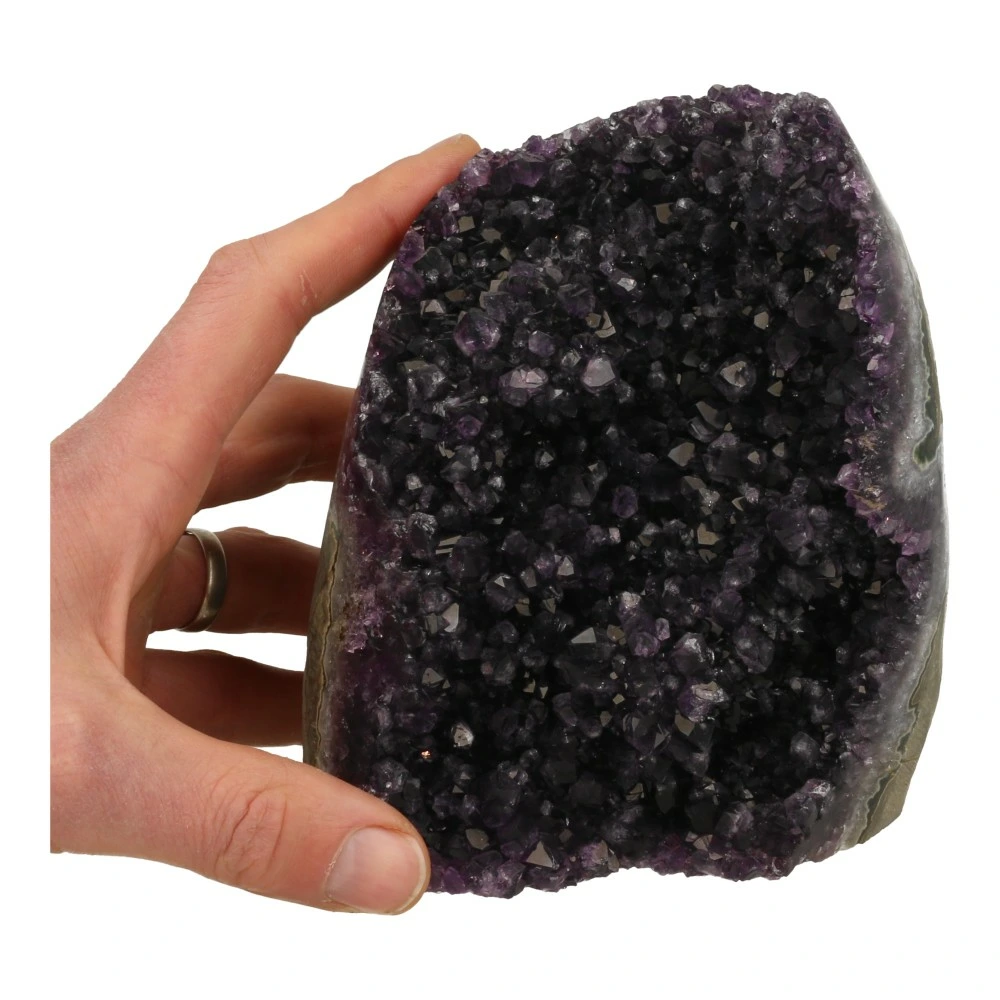 Deze set bestaat uit een prachtig donkerpaarse amethist uit Uruguay van 14,5cm hoog, 12,5cm breed en 10cm diep. De ruwe bergkristal punt uit Brazilië is ongeveer 14cm hoog, 10cm breed en 10cm diep. De punt heeft een kleine beschadiging door het winnen. De rozenkwarts bol uit Madagaskar heeft een diameter van 8,5cm en is inclusief een houten ring. Je ontvangt de gouden driehoek set van de foto.