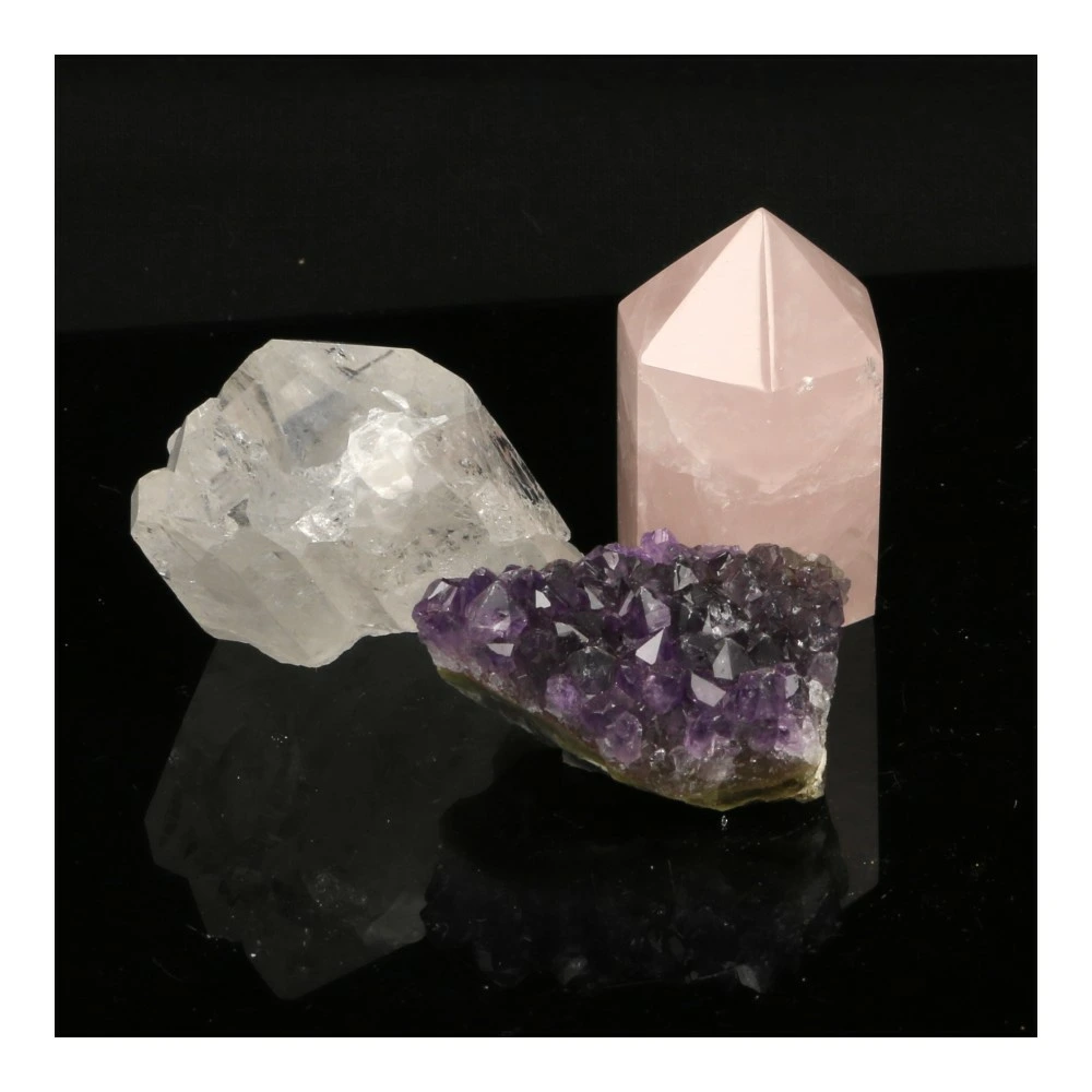 Deze set bestaat uit een ruw amethist uit Brazilië van 3,7 x 2,6cm en 2cm hoog. Het fraaie bergkristal cluster met heldere energie heeft een hoogte van 3,5cm, een breedte van 4,4cm en is 2,3cm diep. De set wordt afgemaakt door een geslepen rozenkwarts toren uit Madagaskar van 4cm hoog en een basis van 2,4 x 2,4cm. Je ontvangt de gouden driehoek set van de foto.