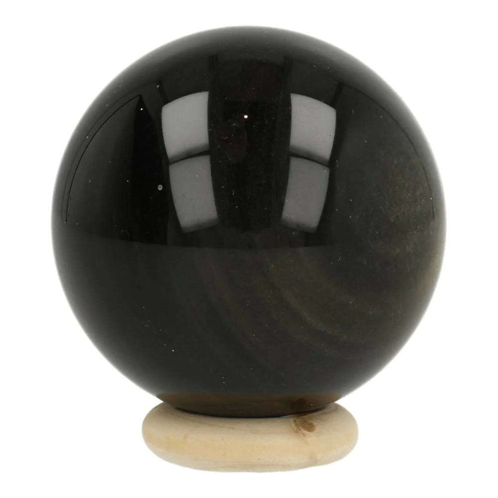 Mooie zwarte goudglans obsidiaan bol met een diameter van 44mm. In het licht komt de zilver-gouden glans van de obsidiaan bol goed naar voren, in de schaduw lijkt deze bol bijna zwart. Je ontvangt de goudglans obsidiaan bol van de foto met houten ring.