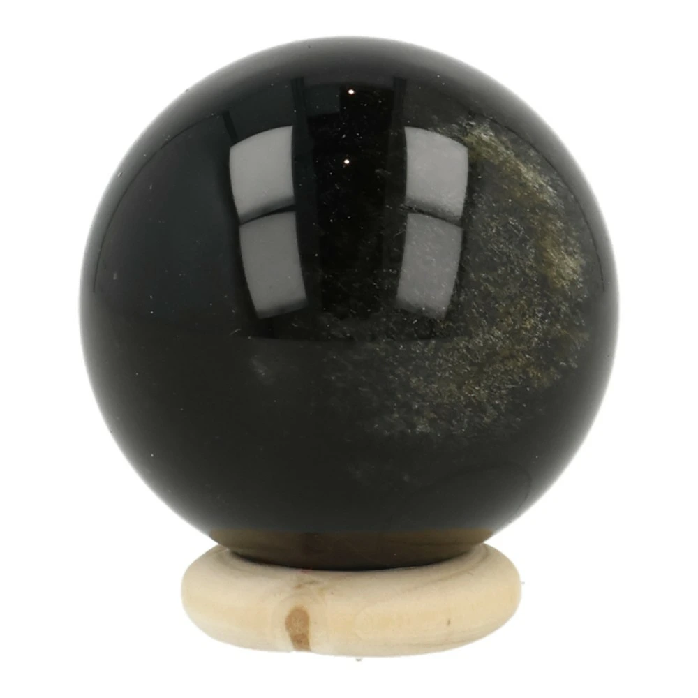 Mooie zwarte goudglans obsidiaan bol met een diameter van ongeveer 4cm (38-39mm). In het licht komt de zilver-gouden glans van de obsidiaan bol goed naar voren, in de schaduw lijkt deze bol bijna zwart. Je ontvangt een soortgelijke goudglans obsidiaan bol als op de foto’s met houten ring. De kwaliteit is zeer gelijkwaardig.
