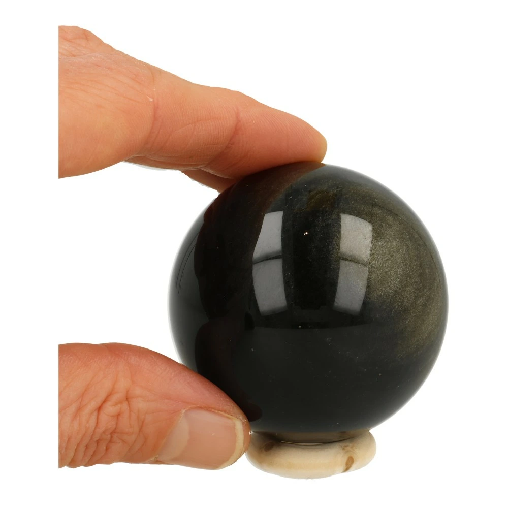 Mooie zwarte goudglans obsidiaan bol met een diameter van circa 51mm ‘nr1’. In het licht komt de gouden glans van de obsidiaan bol goed naar voren, in de schaduw lijkt deze bol bijna zwart. Je ontvangt de goudglans obsidiaan bol van de foto met houten ring.
