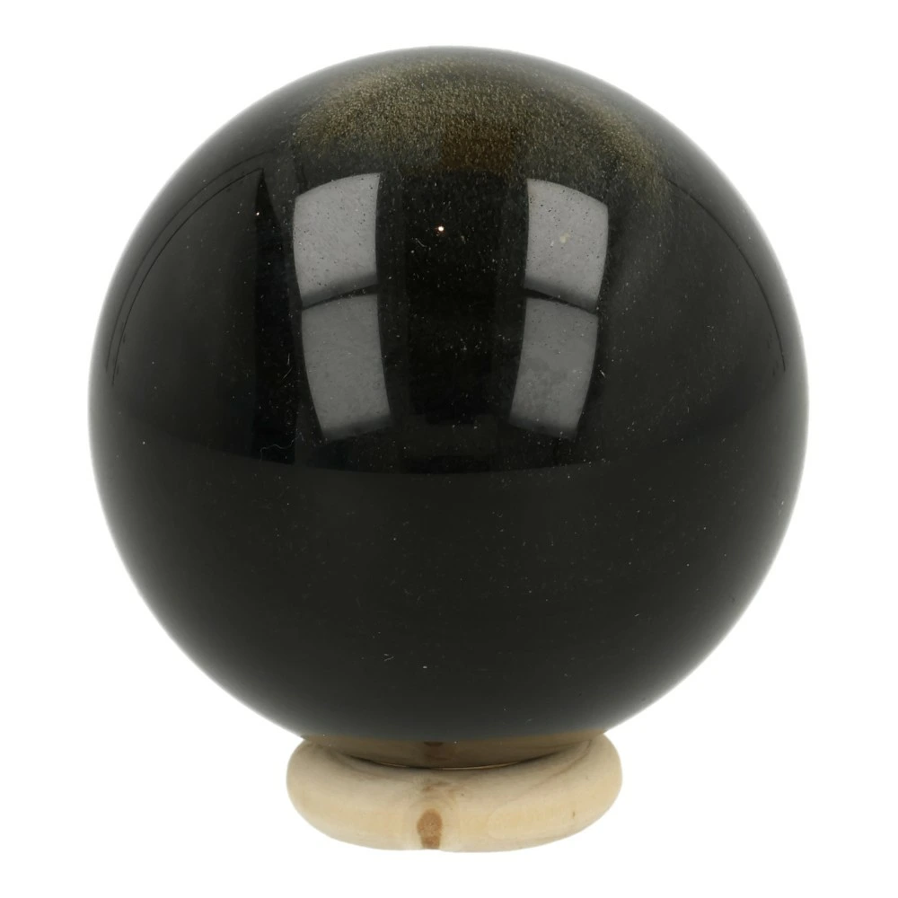 Mooie zwarte goudglans obsidiaan bol met een diameter van circa 52mm. In het licht komt de gouden glans van de obsidiaan bol goed naar voren, in de schaduw lijkt deze bol bijna zwart. Je ontvangt de goudglans obsidiaan bol van de foto met houten ring.