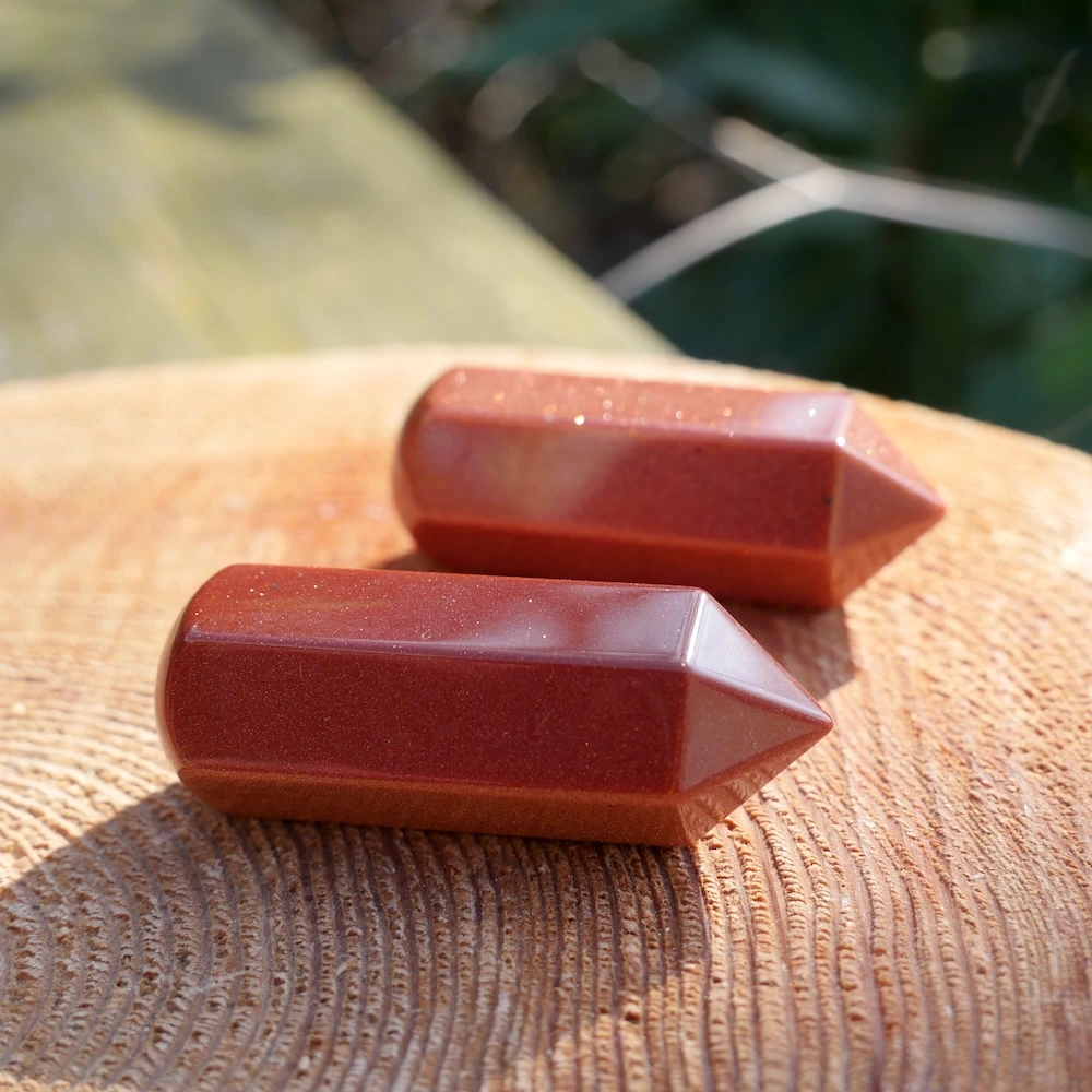 Goudsteen massagesteen van circa 5cm lang en 2cm hoog en diep. Deze zeshoekige massagestaaf heeft een bolle onderkant en spitse punt, zodat je zowel de spieren kunt masseren als meridiaanpunten kunt stimuleren. Je ontvangt een soortgelijke goudsteen massagestaaf als op de foto. Goudsteen is fraai, door mensen gemaakt materiaal met schittering van stukjes koper en is geen natuurlijke edelsteen.