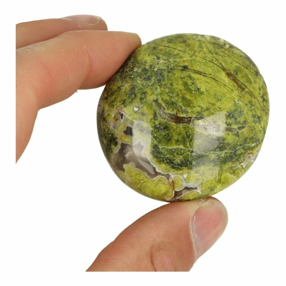 Mooi gemêleerde groene opaal knuffelsteen van 5-6cm lang en 2-3 cm dik. Je ontvangt een soortgelijke groene opaal knuffelsteen als op de foto.