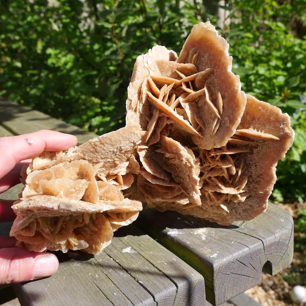 Fraaie grote woestijnroos (nr.9) met een afmeting van ongeveer 22 x 16 x 14cm en een gewicht van 2,38kg uit Tunesië. Deze woestijnroos heeft een fraaie vorm met verfijnde ‘rozen’ aan beide zijdes en kan ook op verschillende manieren staan. Een uniek stuk zo uit het zand. Je ontvangt de grote woestijnroos van de foto.