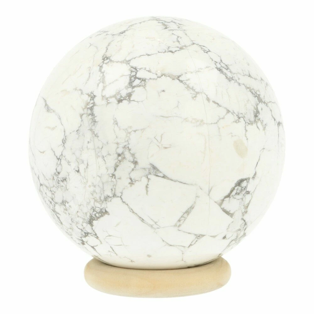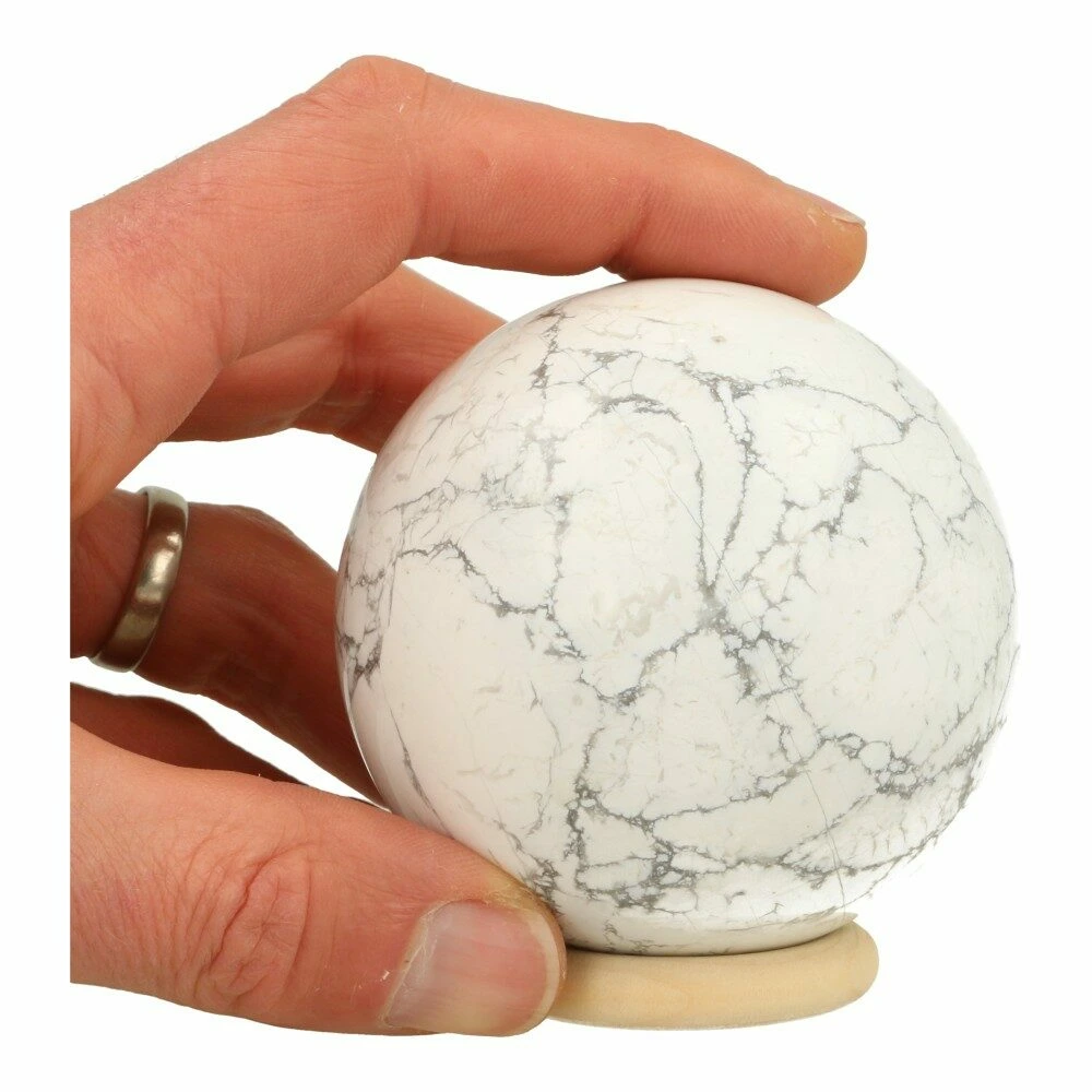 Wit met grijs geaderde howliet bol met een diameter van circa 55mm op houten ring. Je ontvang de howliet bol van de foto.