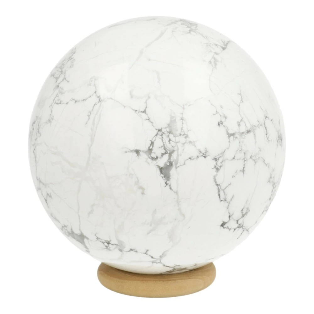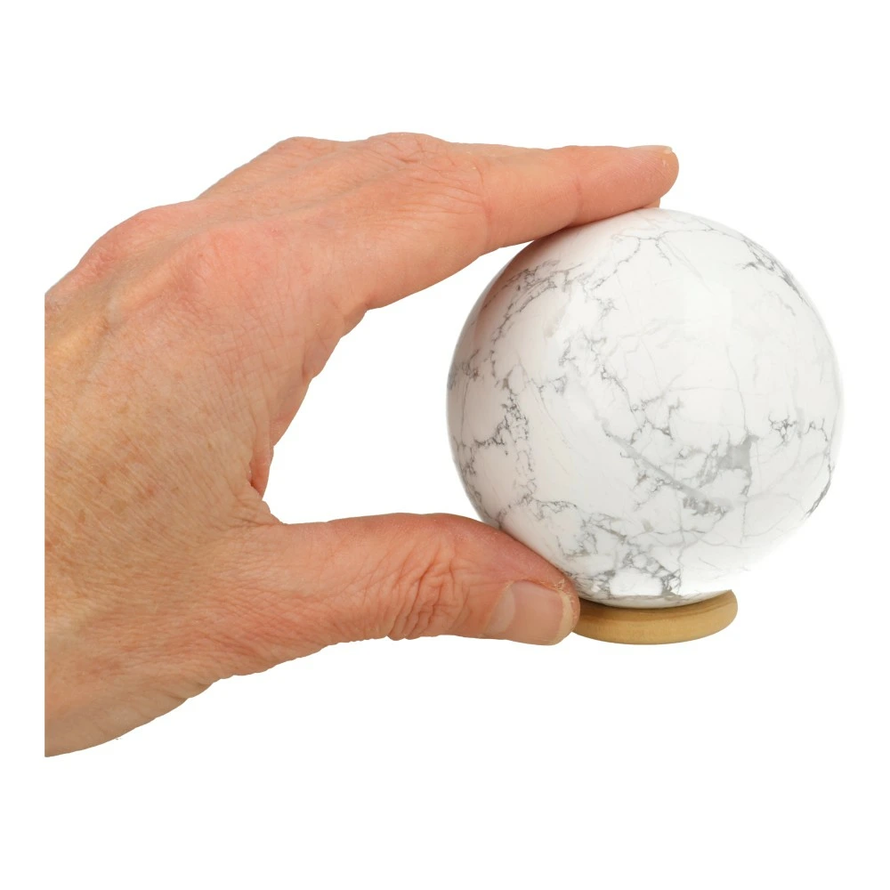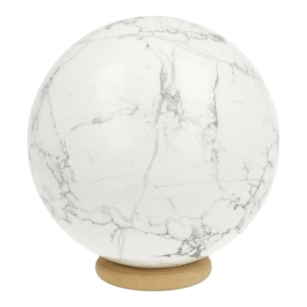 Wit met grijs geaderde howliet bol met een diameter van ongeveer 71mm op houten ring. Je ontvang de howliet bol van de foto.