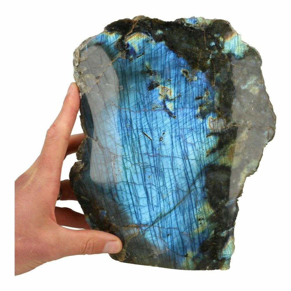 Fraaie labradoriet enkelzijdig gepolijst uit Madagaskar. Deze ruwe labradoriet heeft een groot gepolijst vlak en staat mooi rechtop. De voorzijde heeft een mooie blauwe glans en is in het echt nog mooier dan op de foto’s. De afmetingen zijn ongeveer 25cm hoog, 20cm breed en 7cm diep. Je ontvangt uiteraard de half gepolijste labradoriet van de foto.