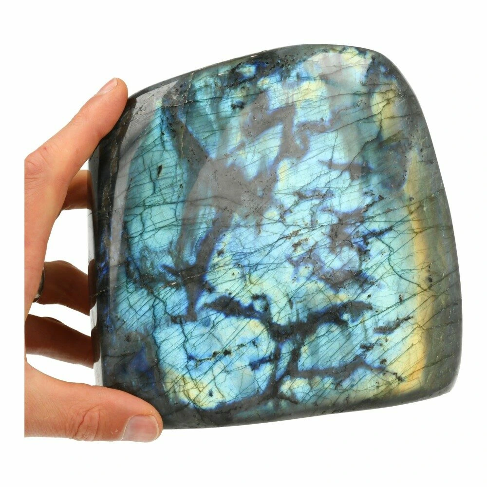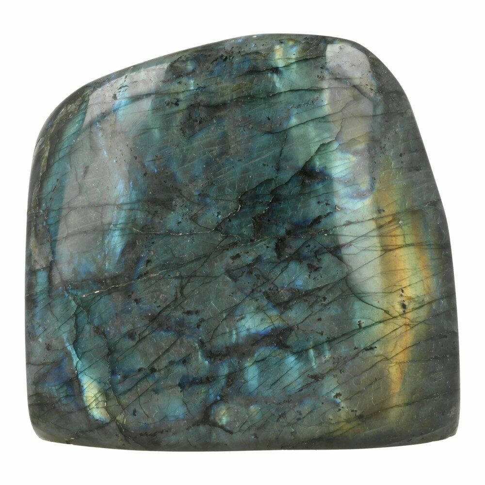 Fraaie grote gepolijste labradoriet zuil XL van maar liefst 4,4kg met een groot helder geel-groen-blauw glimmend vlak. De achterzijde bevat minder gekleurde vlakken. De afmetingen zijn ongeveer 18,5cm hoog, 19cm breed en 6cm dik. Je ontvangt de labradoriet zuil van de foto. In het echt is deze nog veel mooier dan op de foto’s. Door de verlopende glans is de aanblik vanuit iedere hoek anders, en overal mooi!