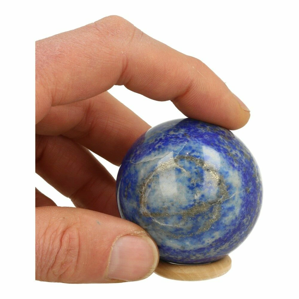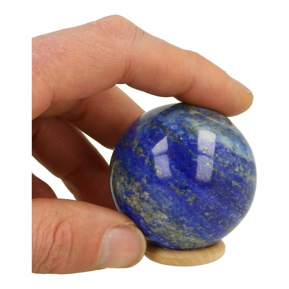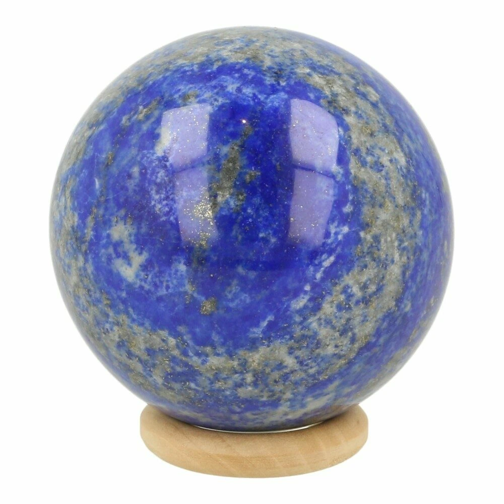Fraaie helderblauwe lapis lazuli bol met een diameter van 51mm en houten ring. Je ontvangt de lapis lazuli bol van de foto’s.